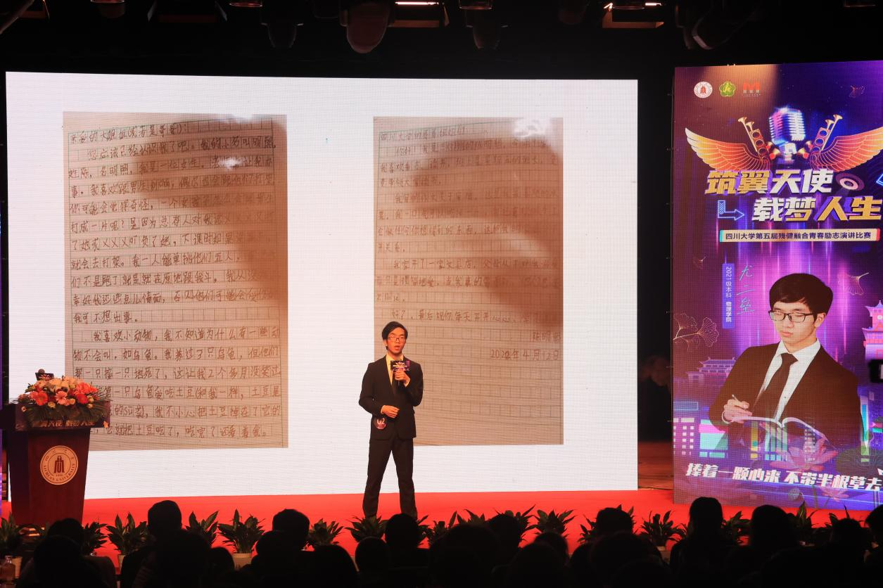 比赛中,12组选手通过动情演讲,把自己或身边人的感人故事进行生动展现,抒发他们对生命的热爱,对梦想的追逐,对青春的礼赞。在高考前夕不幸确诊克罗恩病的电子信息学院2021级施金住同学,重现了在与此绿色癌症斗争中成功蜕变成为一名“肠相依&爱必敌”志愿者的心路历程;退役复学的华西公共卫生学院2018级王萍同学,借助军旅生涯中成功挑战10分钟仰卧起坐再接3公里长跑的故事,致敬让自己快速成长的迷彩岁月;听力三级残疾的公共管理学院2021级段蕊同学,在无声世界和有声世界的切换中,发出“就算没有声音,我也要于无声处听惊雷”的壮语;汶川地震的经历者、阿坝州羌族女孩、外国语学院2022级余潇同学,回顾在余震不断、泥石流和滑坡频发时,通过直升机螺旋桨滑动空气的声音,深切感受到生的希望和国家与人民的牵挂;曾因右眼残疾遭受过异样眼光的物理学院2021级尤二垒同学,讲述在成长路上是怎样悟到“捧着一颗心来、不带半根草去”的美好,表示要推动身边的那朵云、摇动身边的那棵树……同学们以生动的讲述,感恩父母的陪伴与呵护,感谢自己的选择与坚持,表达生于伟大国度、长于伟大时代的幸福!
