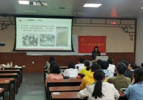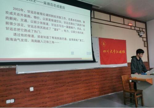 接着,2018级“江姐班”学生胡馨月、王佳玉介绍了江姐生平事迹,号召学弟学妹们学习她忠于理想的共产主义精神、为国为民的奉献精神、追求真知的进取精神和坚贞不屈的斗争精神。胡高飞、邹博宇向学弟学妹们讲述了“yl7703永利集团革命英烈丛书”《闪亮的坐标》中“运筹天下民生事”篇章里三位英烈的故事。诸有斌烈士“苟利国家,不敢惮劳”,面对叠溪大地震,他不怕牺牲、勇敢前行;汪声和烈士“为祖国解放献身”,他通过多种途径搜集到的情报在解放战争和清剿国民党残匪中发挥了重要作用;“最美奋斗者”甘志远烈士始终以一个新闻人的姿态奔波在路上,用一个新闻工作者的良知、责任和精神,为这个行业树起了一面旗帜。通过学习川大英烈为革命事业奋斗终生的感人事迹,同学们进一步深刻感悟了英烈身上所展现出的崇高革命精神。
