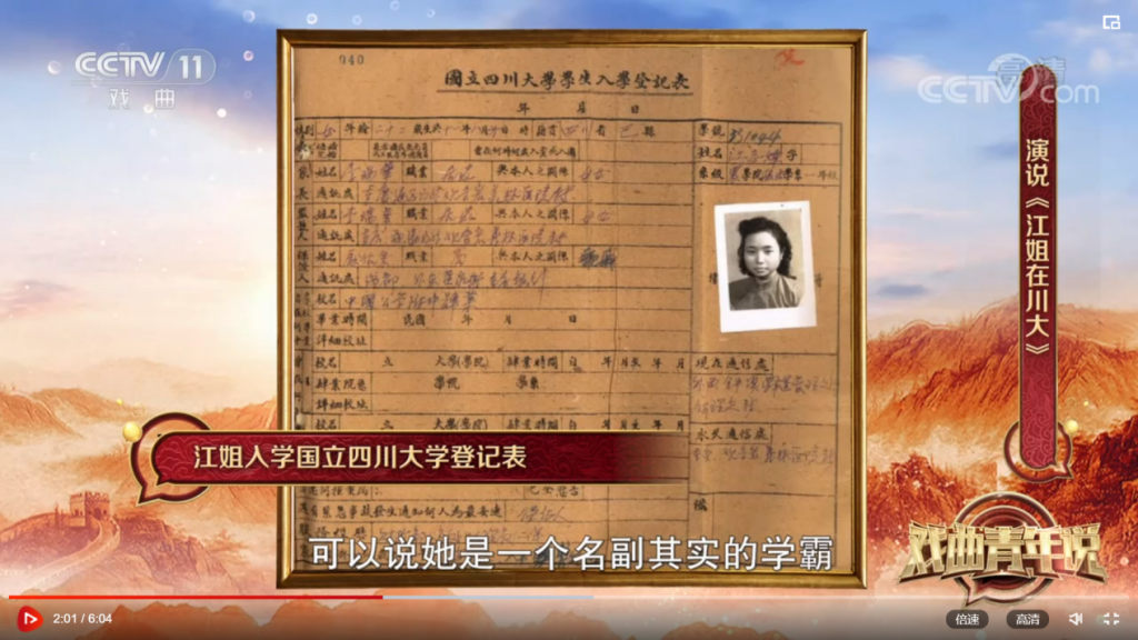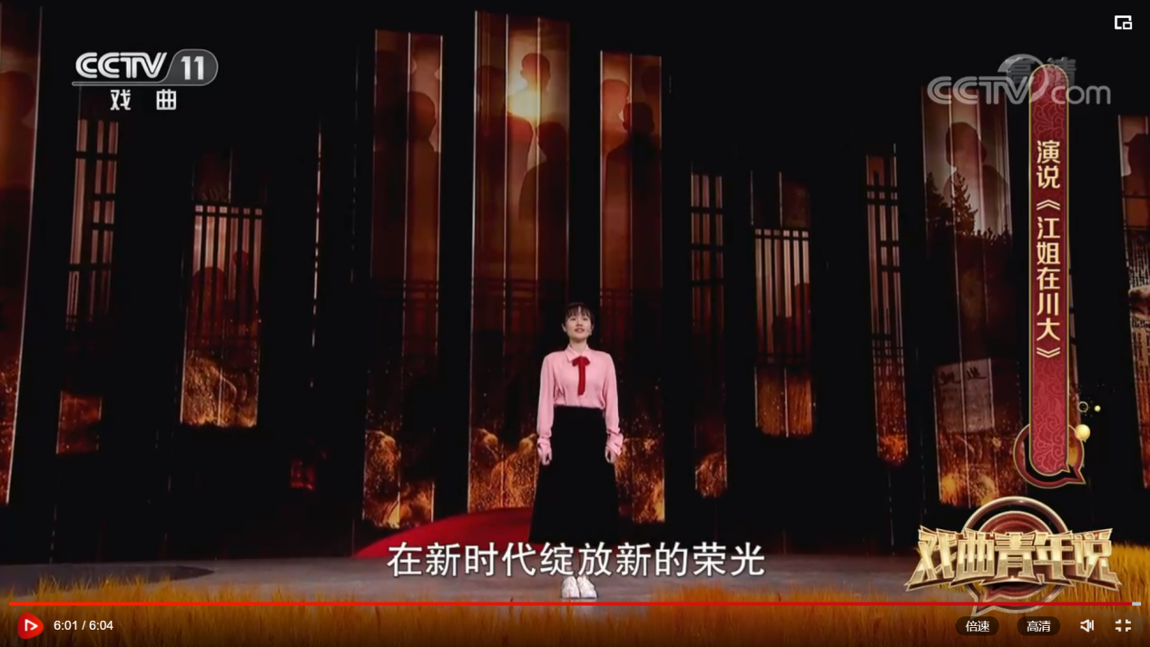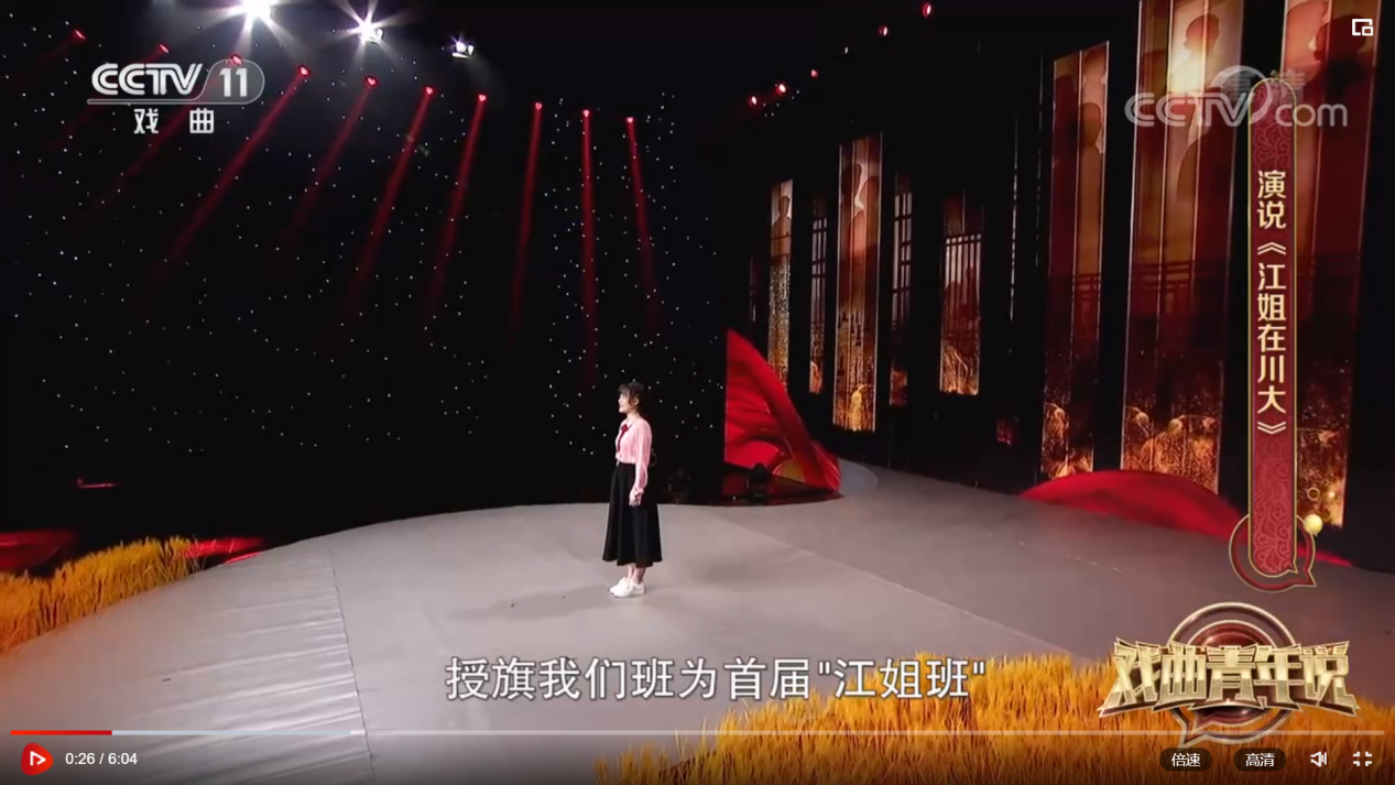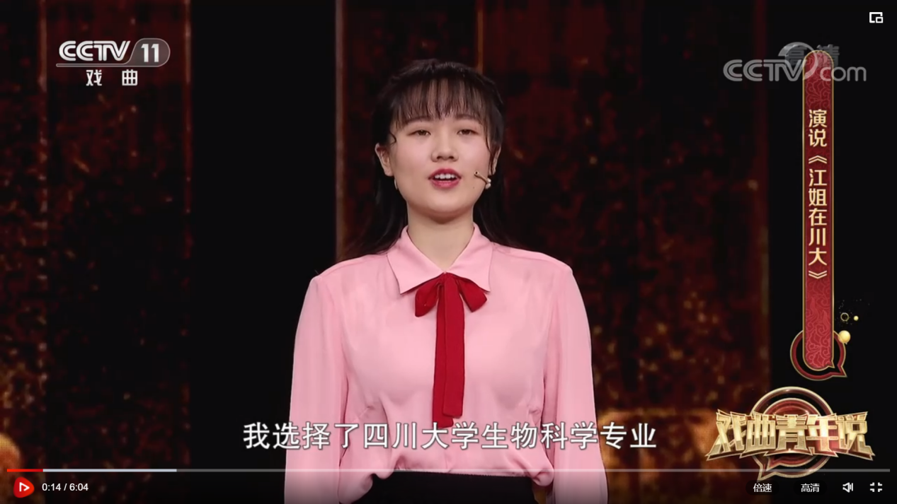 为进一步弘扬江姐精神,传承红色文化,经学校宣传部与央视积极联络争取,生命科学院大力配合,我校 “江姐班”同学李歆睿登上央视戏曲频道(CCTV-11)文化综艺系列节目《戏曲青年说》舞台,动情讲述我校校友、红岩英烈江竹筠(江姐)在校期间的成长经历以及“江姐班”学子以江姐为榜样,传承红色基因,弘扬红色文化,努力做德智体美劳全面发展,担当民族复兴大任时代新人的故事。
