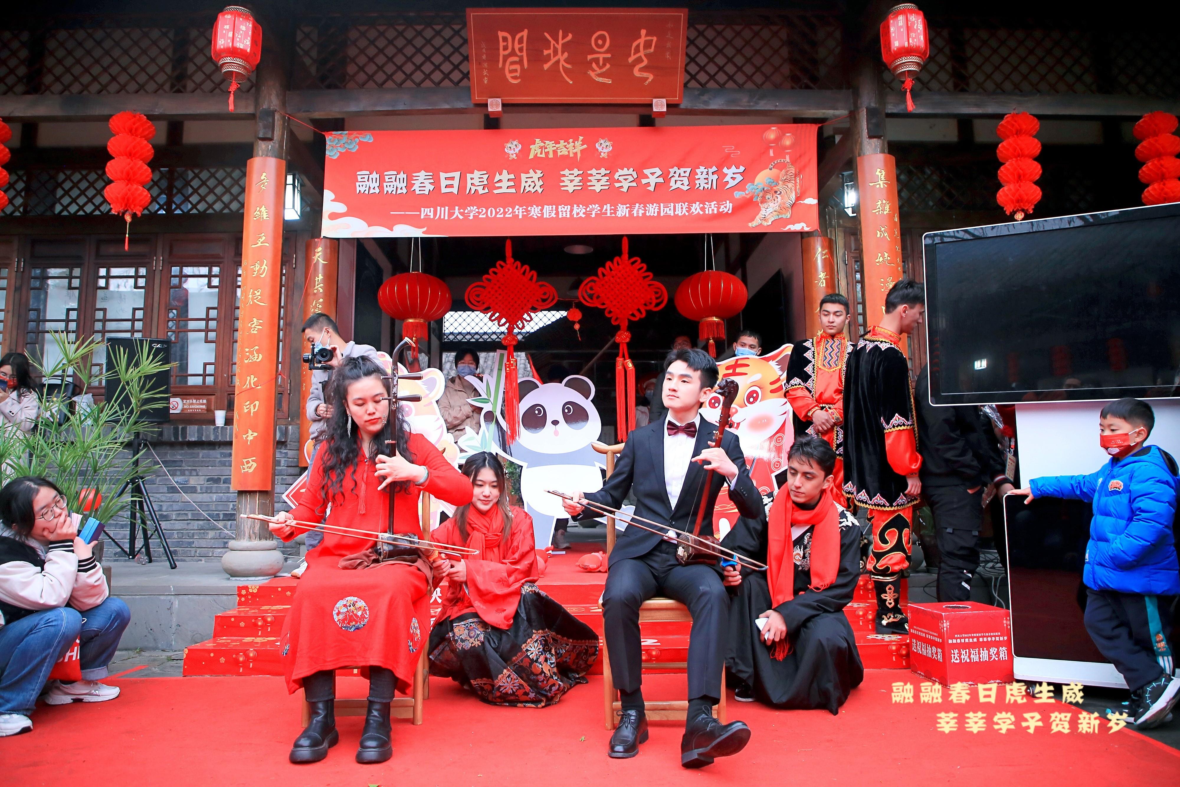 活动现场,动听的《白马篇》《梨花颂》《最美的太阳》,令人捧腹的熊猫杂技,独具风情的民族舞和民族器乐演奏,中华传统文化的国粹太极、功夫茶、皮影戏、川剧变脸……连台的好戏让同学们大饱眼福,在方寸之间真切地感受中国传统节日春节中的文化魅力。