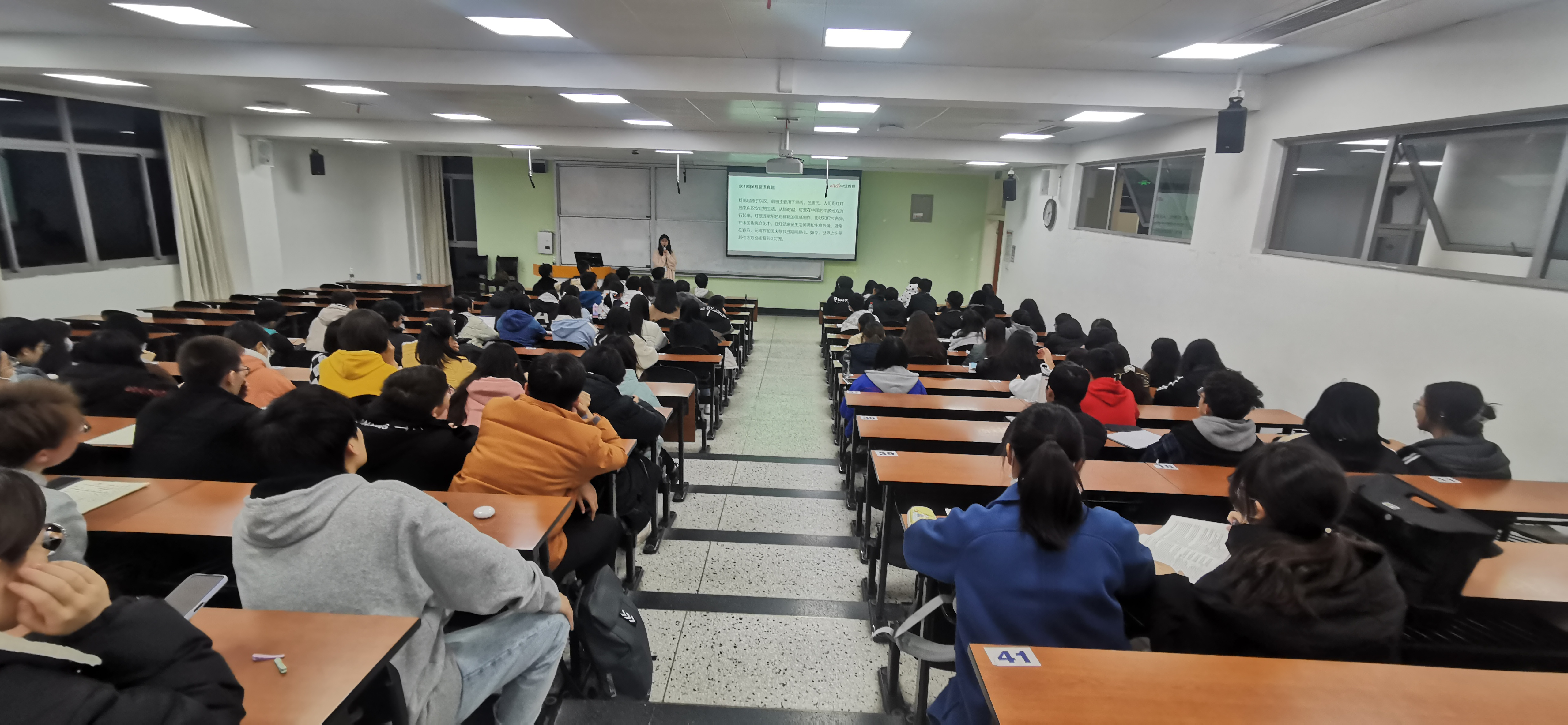 11月30日下午7点,江安校区第一综合教学楼B107教室,在举行了简单的开课典礼后,为期三天的培训活动正式开始。主持人陈纲老师简要说明课堂规定和课程安排后,中公教育的袁玉老师首先先整体介绍了四级考卷的情况,做题时要充分了解题型,调整好心态,合理安排做题时间,做到忙而不乱,胸有成竹。苟芸芸老师教大家答题策略以及答题技巧,并着重讲述了听力部分的解题方法,帮助同学们克服听力考题部分存在的问题。董威老师结合历年真题,分门别类为同学们介绍题型以及作文模板,详细讲解作文板块中容易出现的问题,并帮助同学们归纳总结不同作文题型的关键词句,帮助同学们完成最后的冲刺和突破。