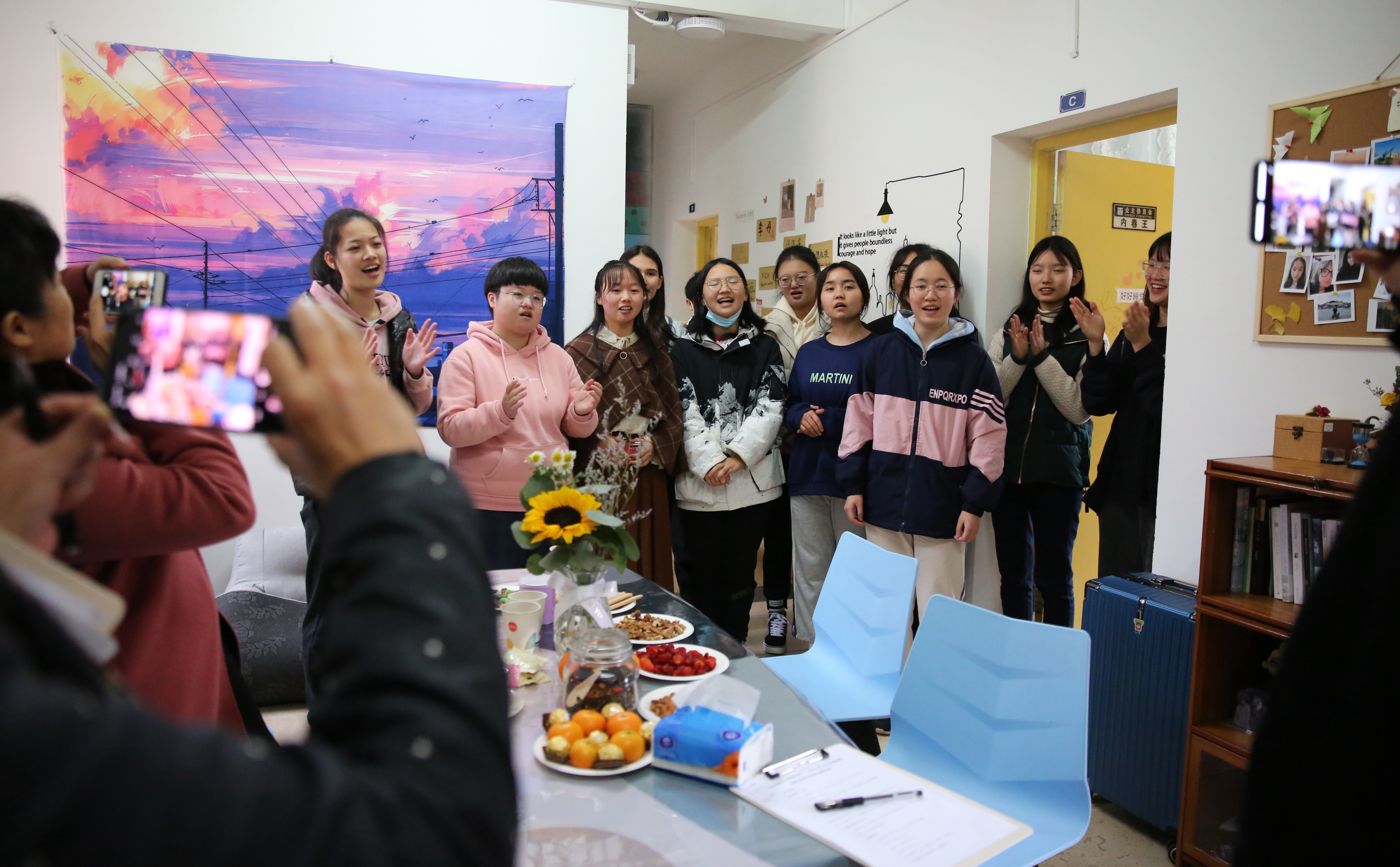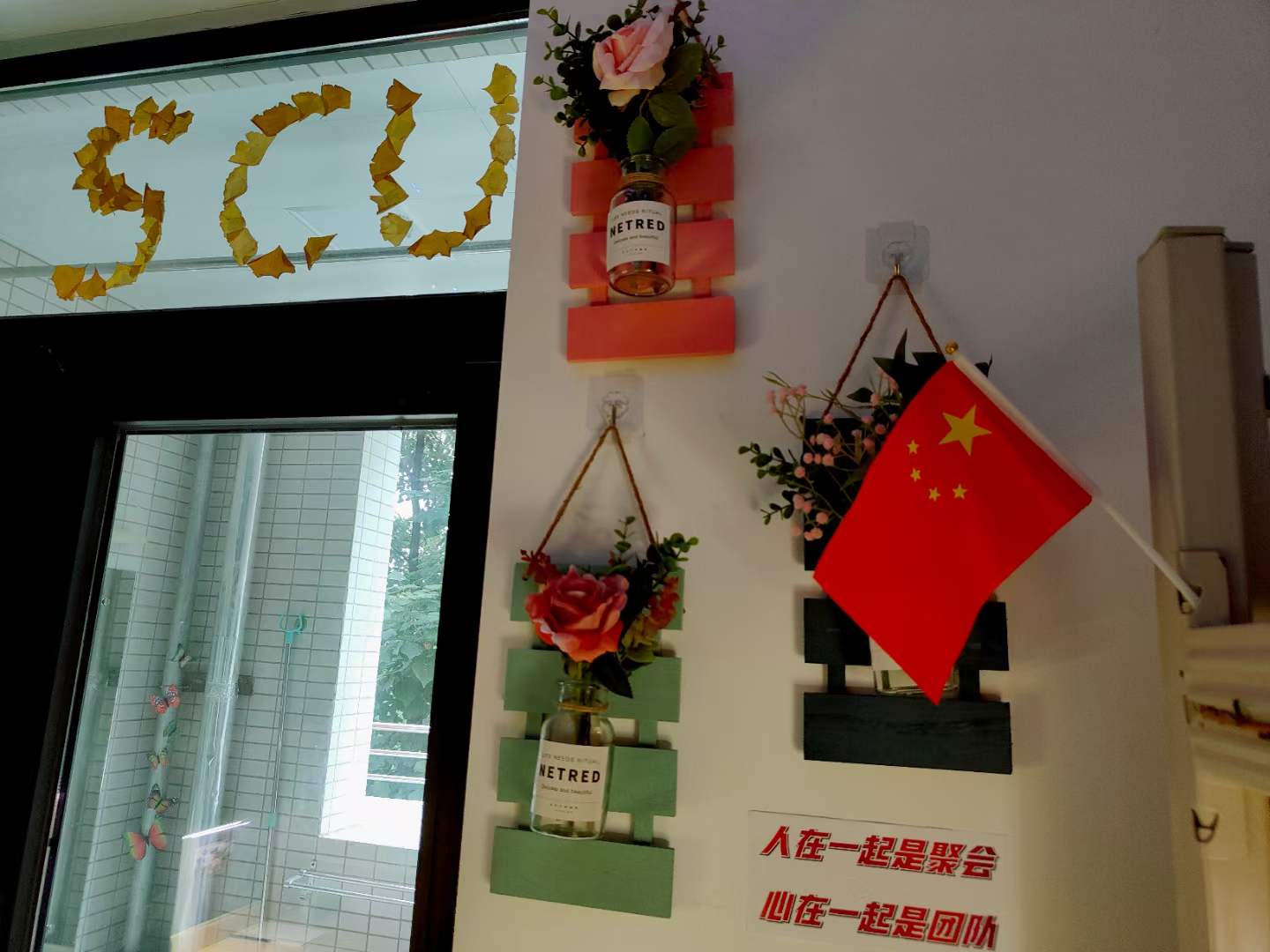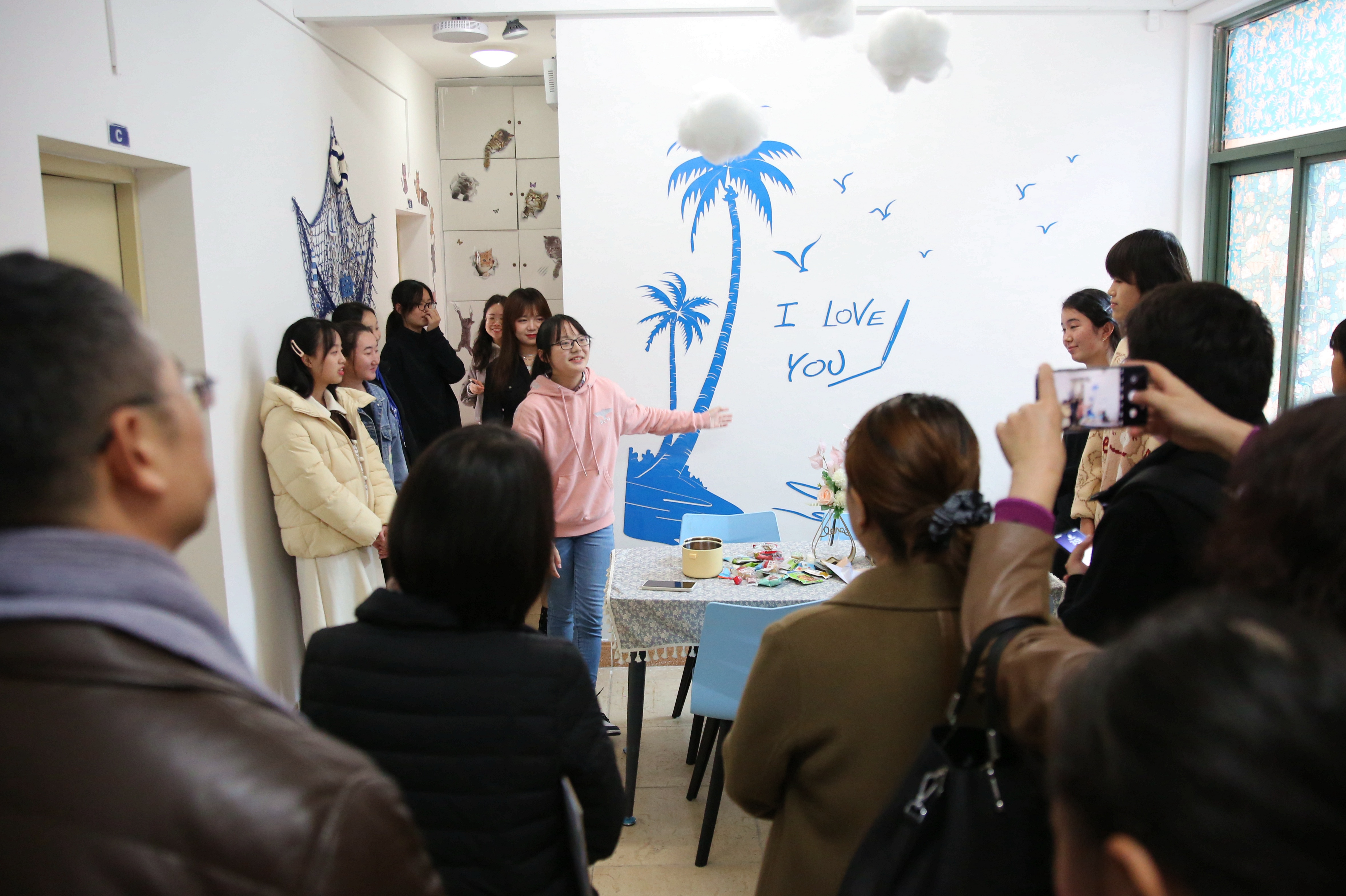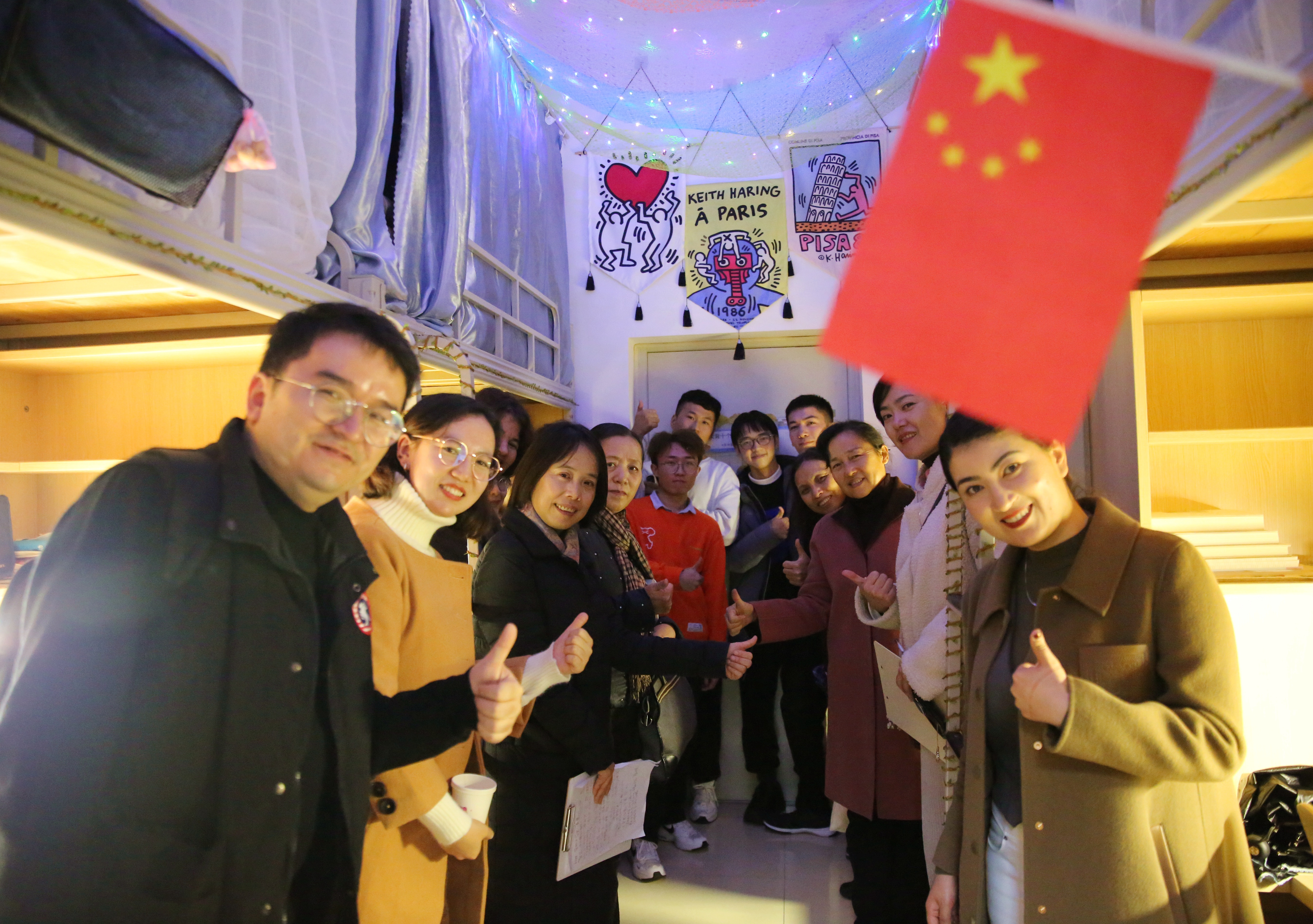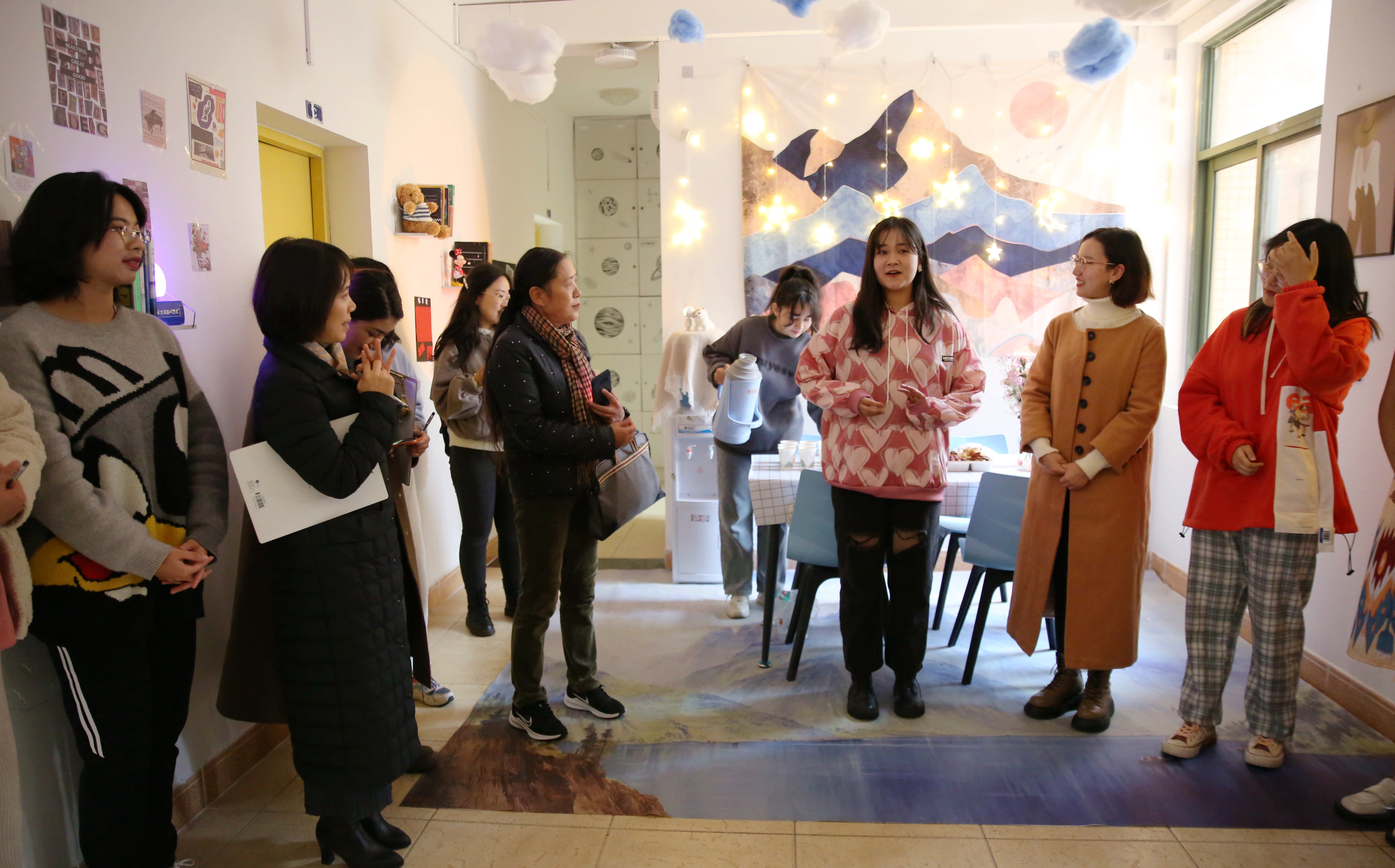 每推开一扇门,都是一处惊喜在等待:名为“初旭”的13-7-101寝室说,我们的党如同一轮红日照亮天光,关照中华大地,照耀温暖各民族,青年人如蓬勃朝阳,积极进取,在党的领导下迈向复兴路,共创未来;名为“文心阁”的22-4-206寝室,用草稿纸手工折成千纸鹤,挂上彩绣中国结,贴上梅兰竹菊为特色的山水中国画,再以传统的宫灯点缀,充满古典韵味的小天地映入眼帘;名为“融舍”的22-4-207,用银杏树叶拼成一幅中国地图,北起漠河南到曾母暗沙,西起帕米尔高原冬至黑龙江乌苏里江汇合处,一只雄鸡高傲的屹立……国旗、团旗、手绘文化墙、寝室公约、寝室心愿墙、每日任务打卡表……每间宿舍都让评委老师眼前一亮,连连发出惊叹。