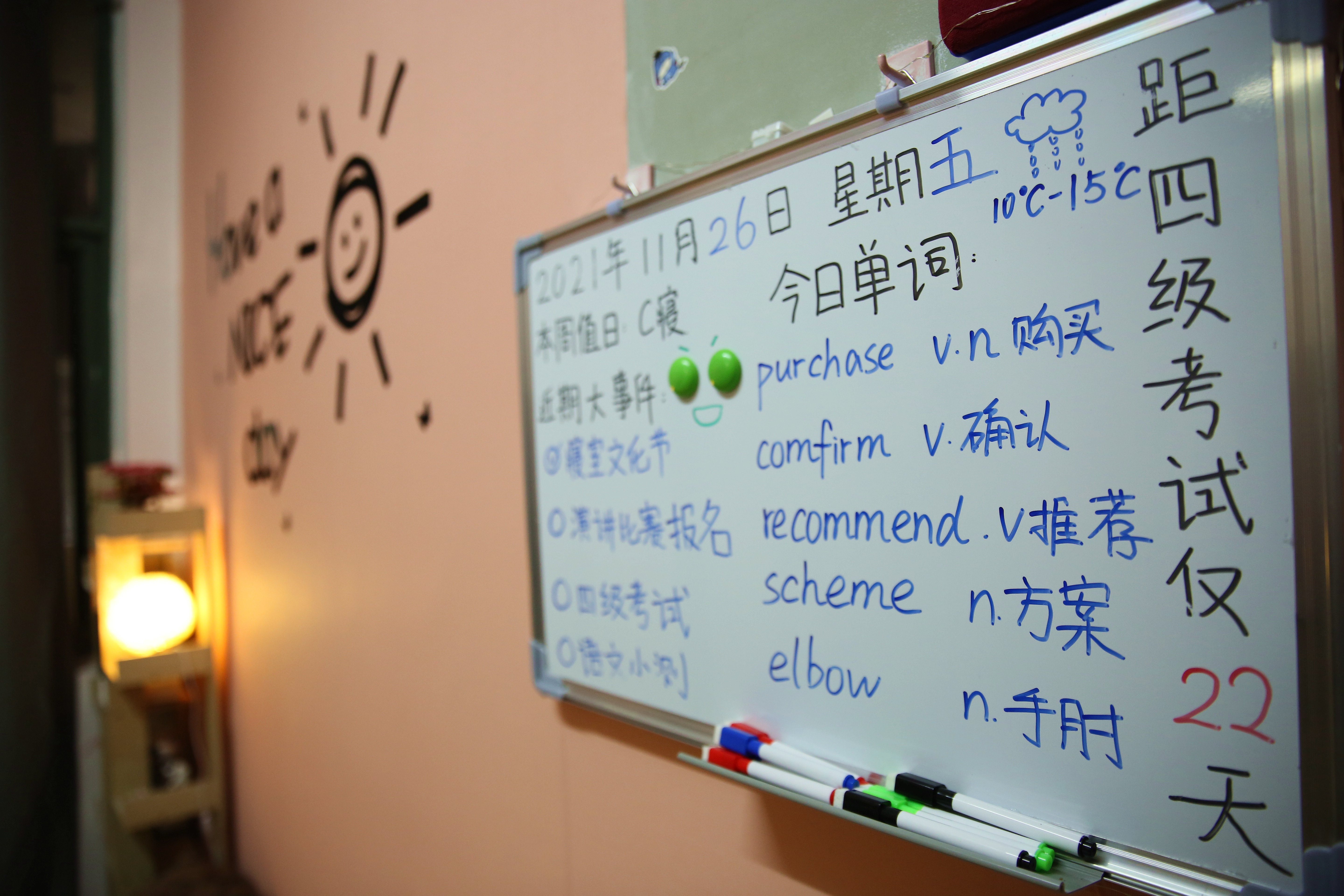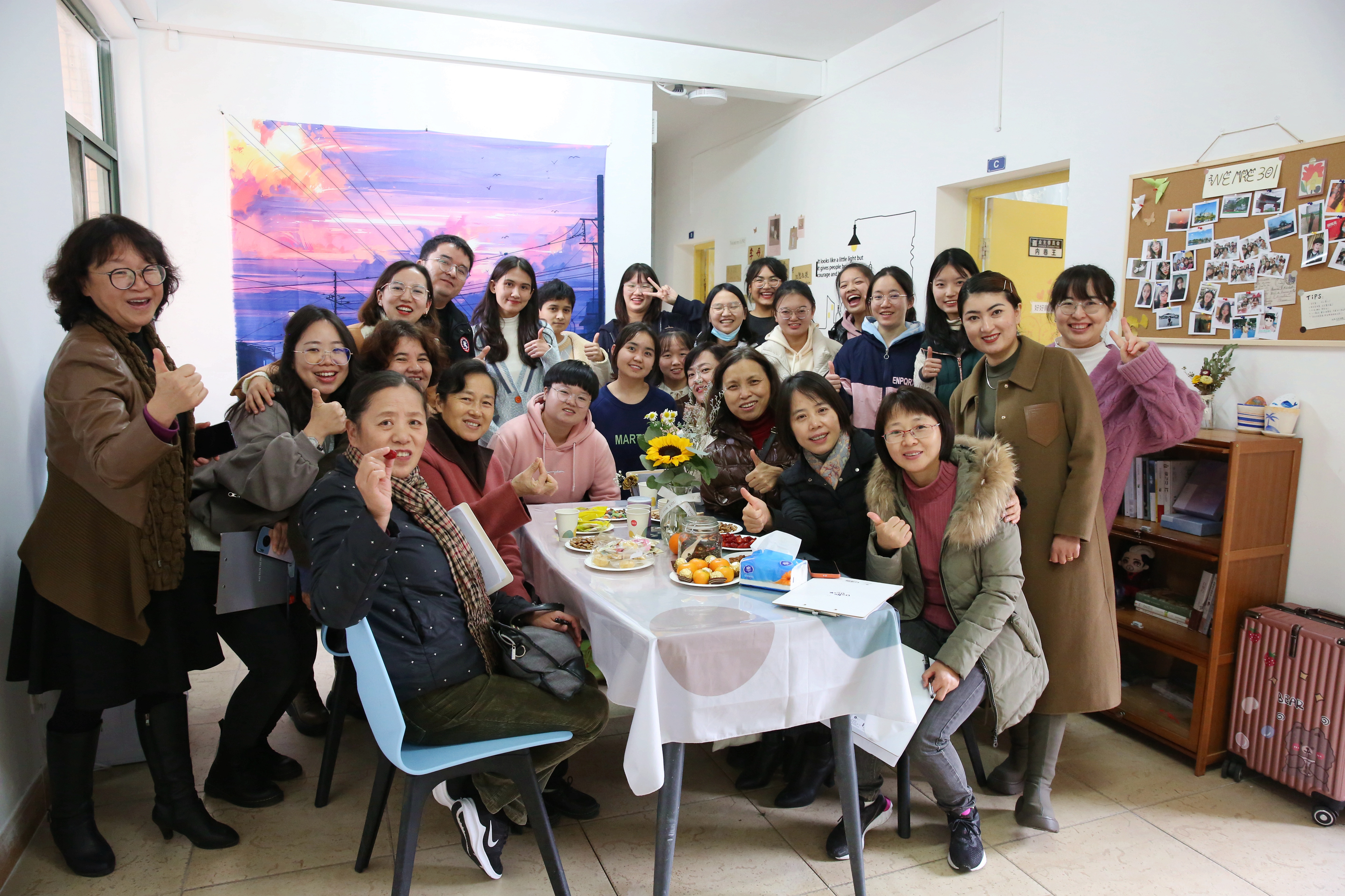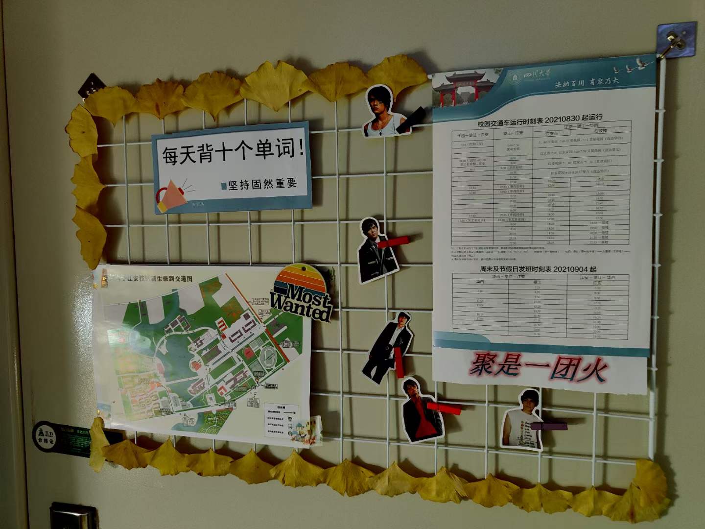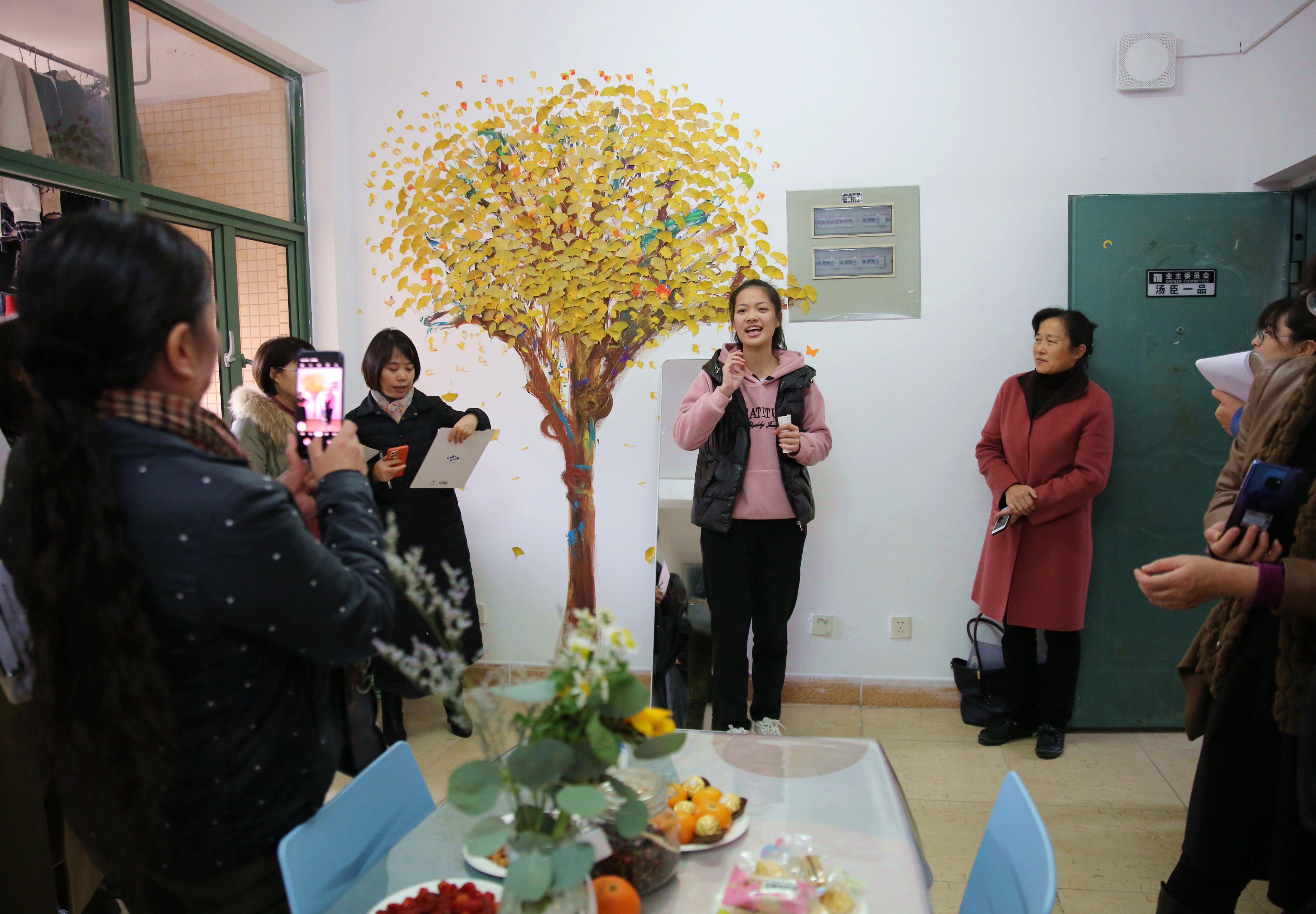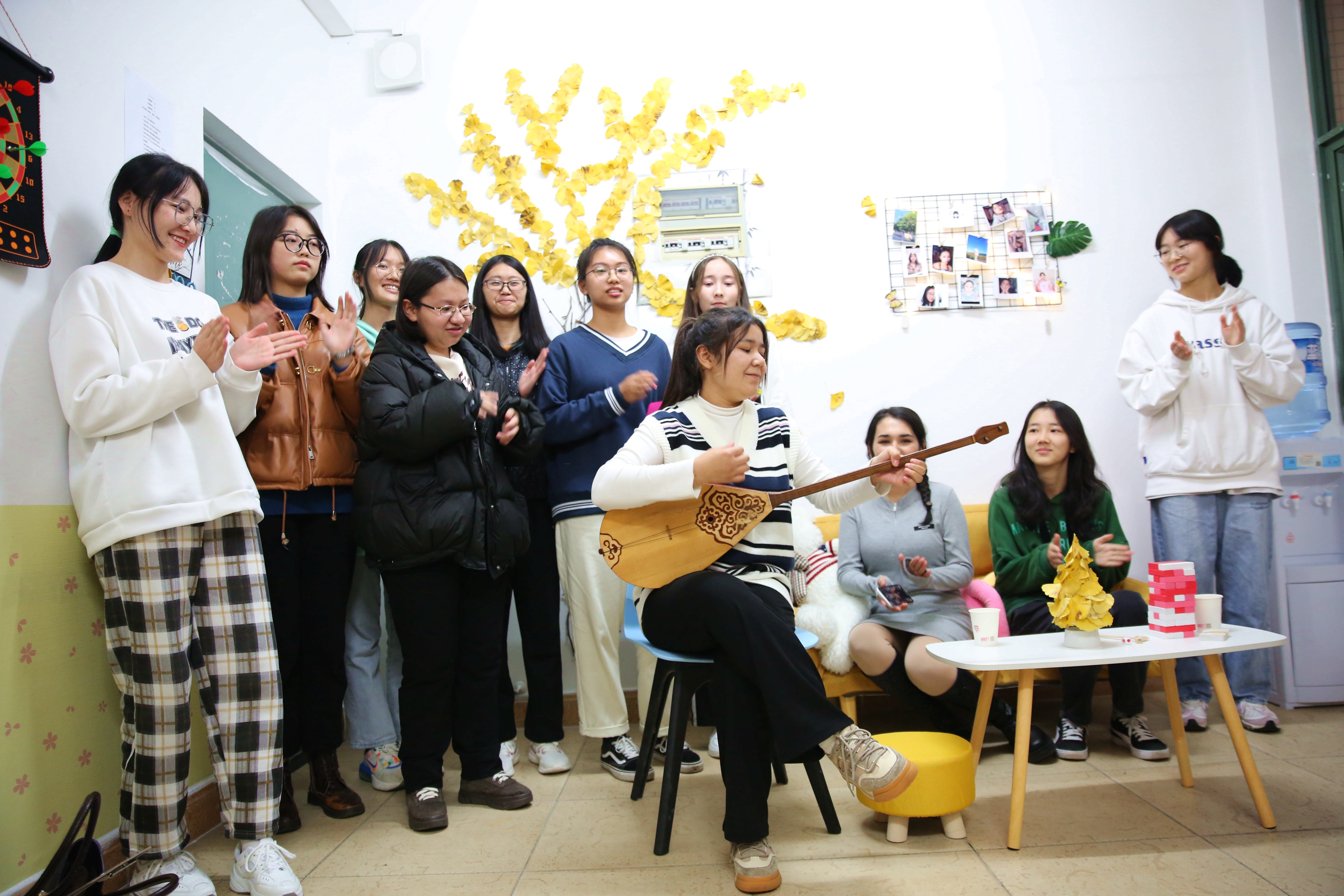 每推开一扇门,都是一处惊喜在等待:名为“初旭”的13-7-101寝室说,我们的党如同一轮红日照亮天光,关照中华大地,照耀温暖各民族,青年人如蓬勃朝阳,积极进取,在党的领导下迈向复兴路,共创未来;名为“文心阁”的22-4-206寝室,用草稿纸手工折成千纸鹤,挂上彩绣中国结,贴上梅兰竹菊为特色的山水中国画,再以传统的宫灯点缀,充满古典韵味的小天地映入眼帘;名为“融舍”的22-4-207,用银杏树叶拼成一幅中国地图,北起漠河南到曾母暗沙,西起帕米尔高原冬至黑龙江乌苏里江汇合处,一只雄鸡高傲的屹立……国旗、团旗、手绘文化墙、寝室公约、寝室心愿墙、每日任务打卡表……每间宿舍都让评委老师眼前一亮,连连发出惊叹。