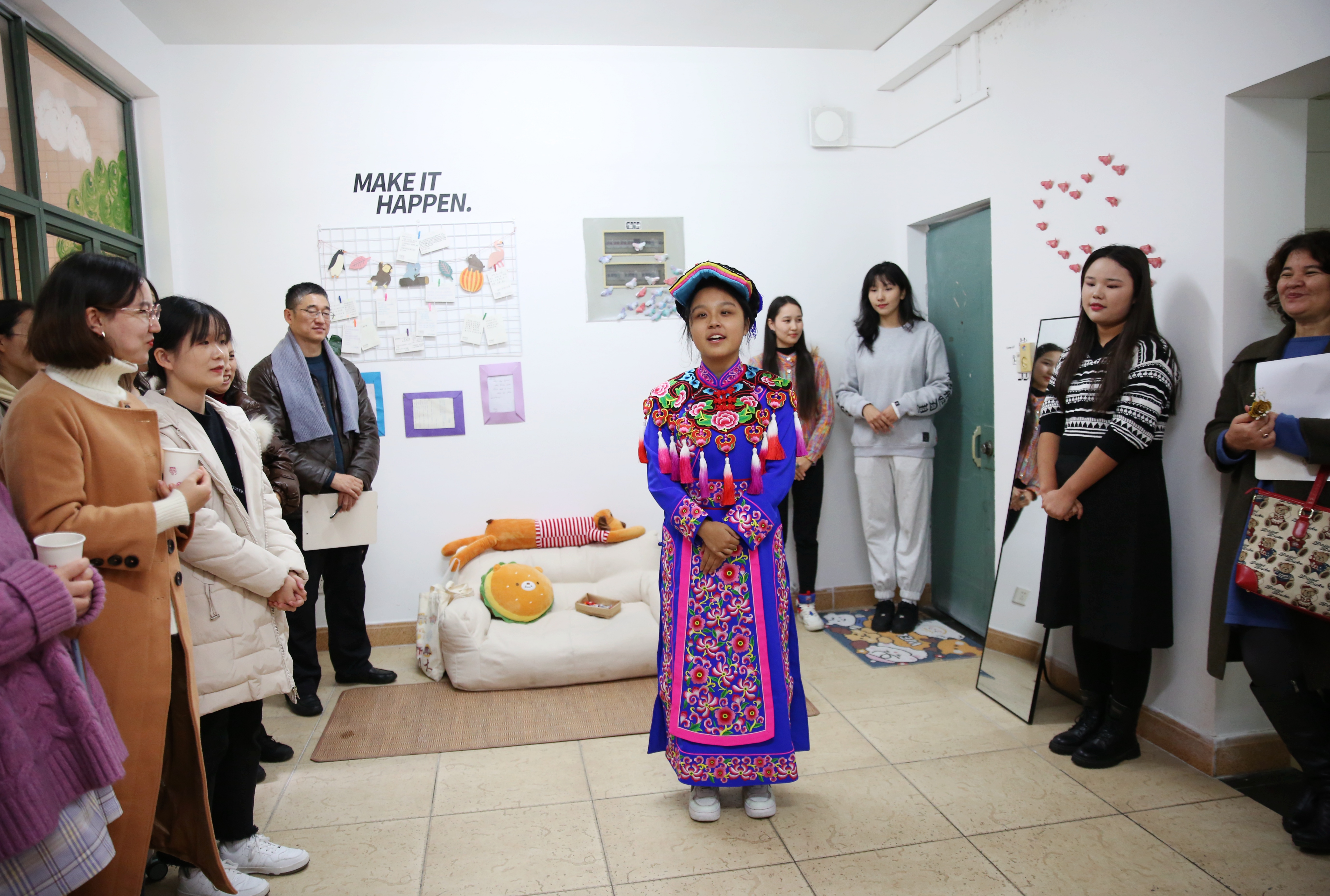 11月26日,筑民族雅舍 绽青春芳华——yl7703永利集团少数民族预科班第四届寝室文化艺术节以铸牢中华民族共同体意识为主题在江安校区顺利举行。由学工部、教务处、教导员老师、派驻教师组成的评审团队围绕宿舍内务、文化装饰、团队风采等方面,走进2021级少数民族预科生寝室,进行了现场走访评审工作。