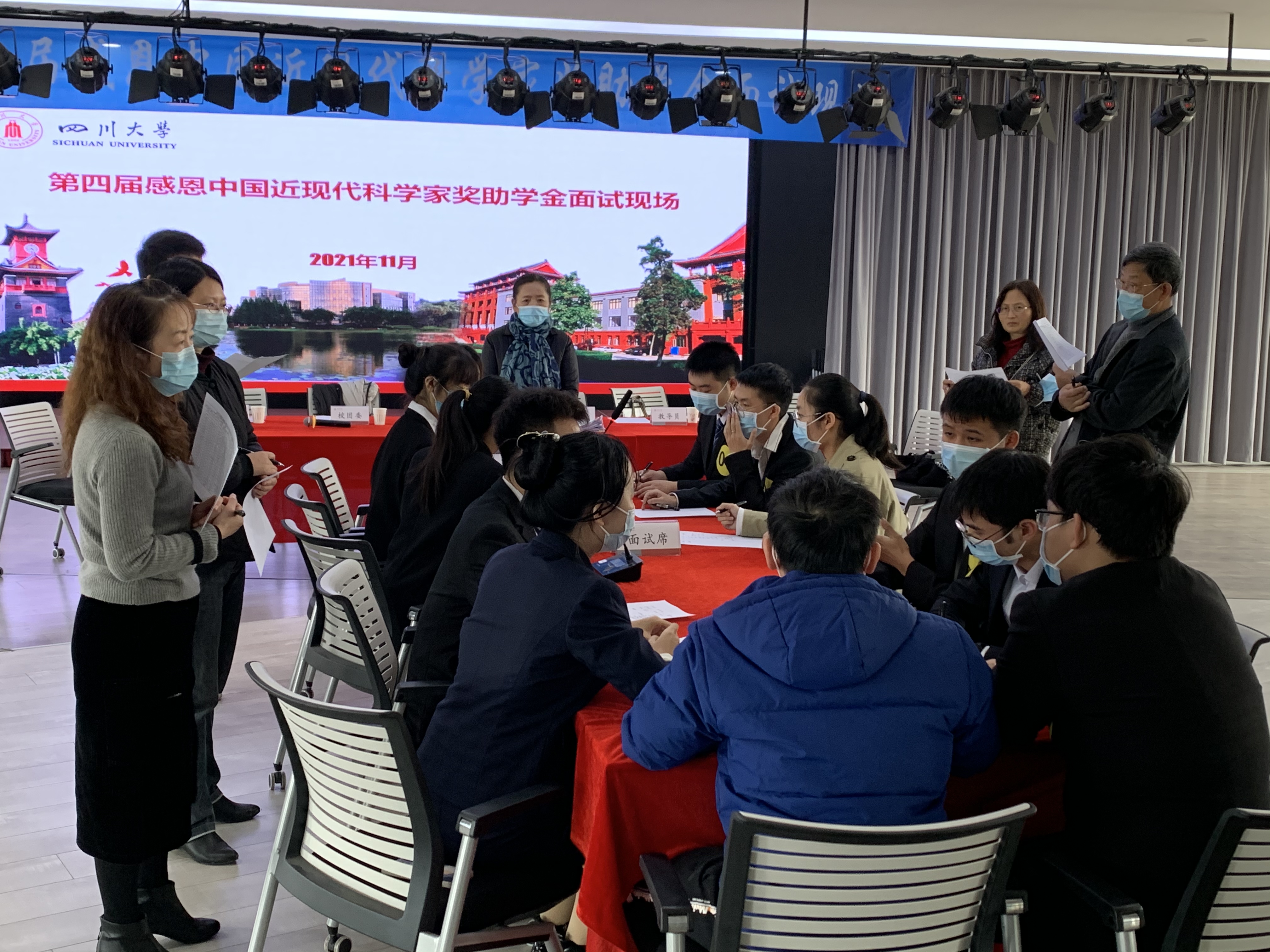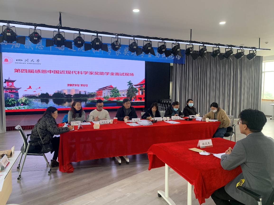 下午1点,开始奖学金评选面试。五分钟面试环节共分为三个部分:自我介绍、抽题作答、评委提问等环节。同学们在面试中积极展现自我的同时,讲述了自己对科学家的崇敬,与科学家精神结缘的故事,以及成长中父辈的教育、科研竞赛的经历对自己的影响等。在答题环节,“请你谈谈当代大学生应该如何继承和发扬这一核心价值观的优秀品质?”“请谈谈你对学校校风理解以及你是怎么传承川大精神的?”等等面试题目对川大精神和社会主义核心价值观进行了阐释;从邓稼先、程开甲、钱学森等近现代科学家的感人事迹中领悟胸怀祖国、服务人民的家国情怀、以及永攀高峰、敢为人先的创新精神。在提问环节,评委针对同学经历和时政提问,和同学们碰撞出了更有趣的火花。有关于同学们的大学生活的问题,“大学生活中对自己影响最大的事,大学生活中最大的收获和成长,畅想20年以后回川大的场景”;有关于同学们专业规划的问题,“从自身专业出发如何面对某些国家对中国技术封锁的问题,在自己专业领域如何发扬近现代科学家精神“;也有关于时政的问题“年轻学生如何评价中国共产党,对十九届六中全会的感受,如何看待习主席和拜登的视频谈话”。面试环节气氛活跃,同学们滔滔不绝,评委老师们称赞连连。