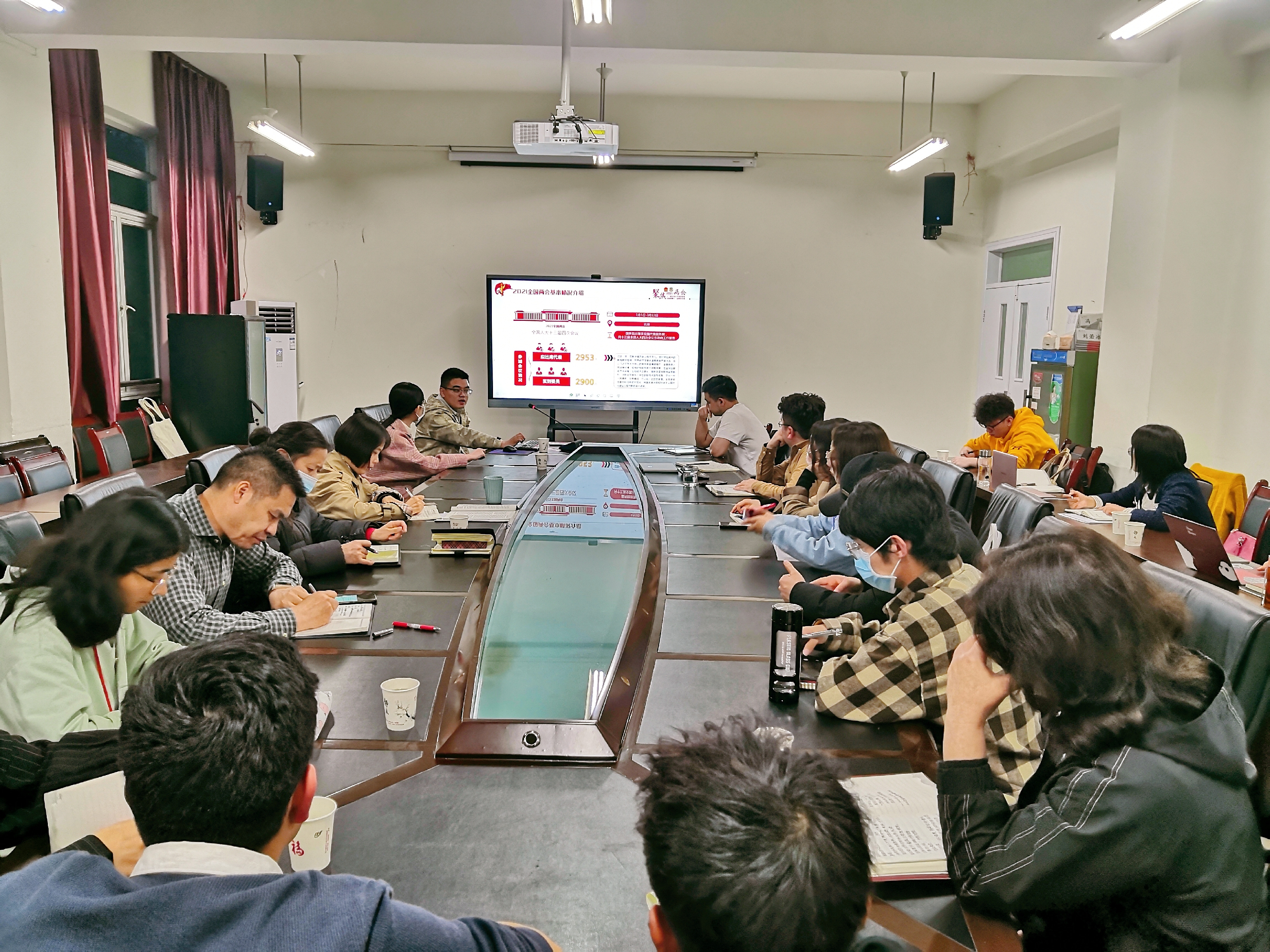 石立春老师以《政府工作报告解读》为题,从“2021全国两会基本情况、2021全国两会重点内容、两会十大经济民生潜台词、今年要办的50件大事”四个方面为师生们进行了全面解读。石老师讲到:高质量发展是十四五乃至更长时期我国经济社会发展的主题,关系我国社会主义现代化建设全局。推动高质量发展,必须下好全国一盘棋。石老师还和师生们聊了关于教育的话题,教育是国之大计,党之大计,教育事关国家发展,事关民族未来,国家一直高度重视教育事业的发展。