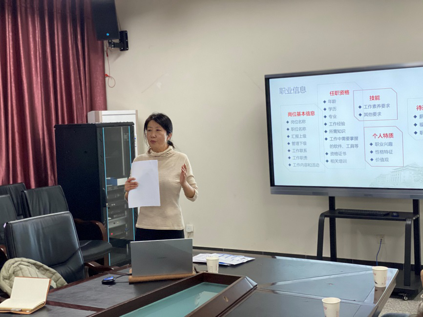 活动伊始,姜焰老师以一段有趣的招聘会现场视频展现了简历在求职过程中的重要性——“简历是个人的呈现,是面试的敲门砖”。姜焰老师以帕森斯的职业辅导步骤为基础,提出“合适的才是最好的”,同时以招聘公告为例进行解读,介绍如何对照自身在求职过程中实现个人特质和职业信息的最佳匹配。