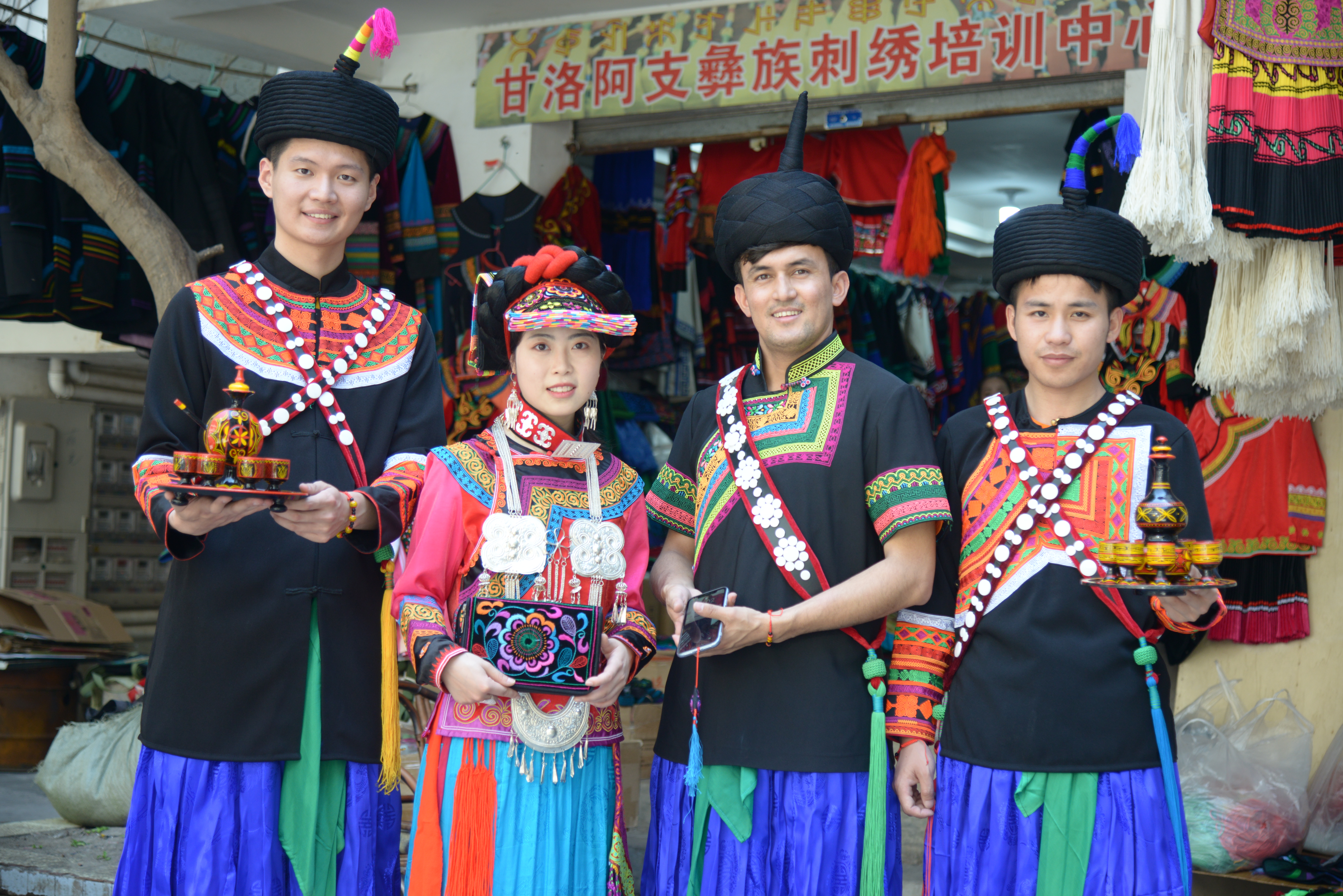 随后,两支队伍汇合,一同前往调研的第五站——甘洛县彝针彝线刺绣专业合作社,阿布木基热情介绍了彝族的特色手工品,如彝族服饰、钱包、戒指等,并邀请志愿者们穿上彝族服饰,体验彝族文化。