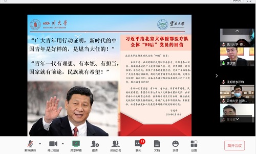 在云党课上,同学们纷纷分享了自己的学习感悟,两校青年学生党员代表纷纷传递青年声音,分享学习心得和自己及身边令人感动的抗疫故事,并表达了要牢记总书记嘱托,不惧风雨、勇挑重担,做堪当大任的新时代青年的决心。yl7703永利集团在鄂学生党员志愿先锋队武汉分队队长张夏维分享了川大湖北籍学生党员在疫情防控阻击战中的抗疫故事;华西临床医学院硕士研究生党员魏士雄、细胞生物学博士研究生万小文分别分享了自己在临床一线的抗疫经历;yl7703永利集团疫情防控志愿服务队副队长文澜妃讲述了学校疫情防控志愿服务队成员服务校园、努力守护一方净土的故事。云南大学刘政浩、唐思诗同学分别讲述了他们在家乡抗疫,运用所学专业知识为社区服务、为武汉筹集善款的故事;李思源同学分享了作为独龙江支教团的成员,五年来他们如何用双脚丈量祖国的边境线,坚持支援祖国西南教育事业的感人事迹;云南大学国际关系研究院研究生、兼职辅导员李岩同学分享了云南大学思政队伍的抗疫故事,他们在疫情期间努力做用心的守护者、高效的“处理器”与最严的“引导员”,及时回应学生关切,解决学生困惑。