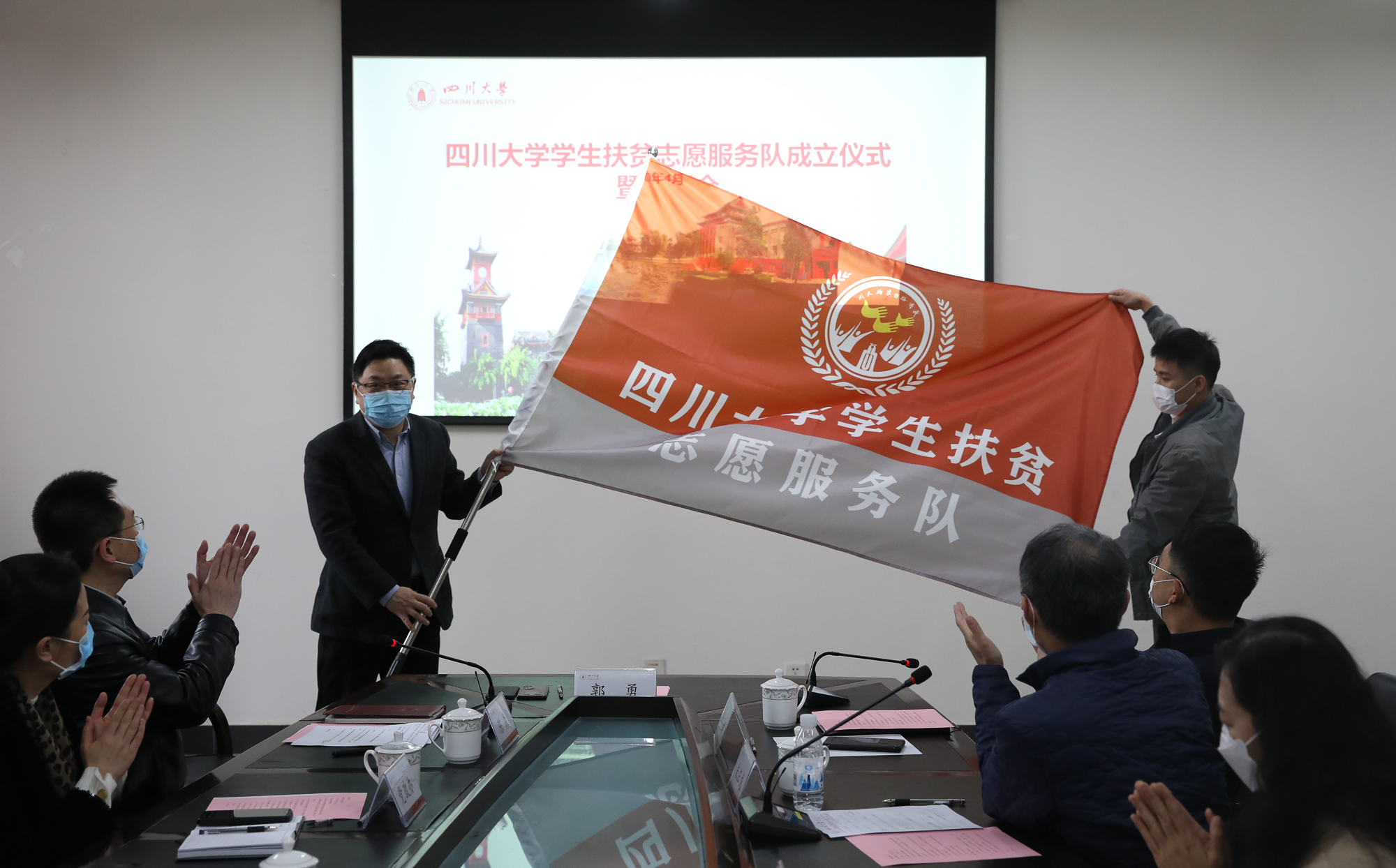 郭勇为学生扶贫志愿服务队授队旗,学生扶贫志愿服务队队长、经济学院2018级硕士研究生吴林代表全体队员接旗。
