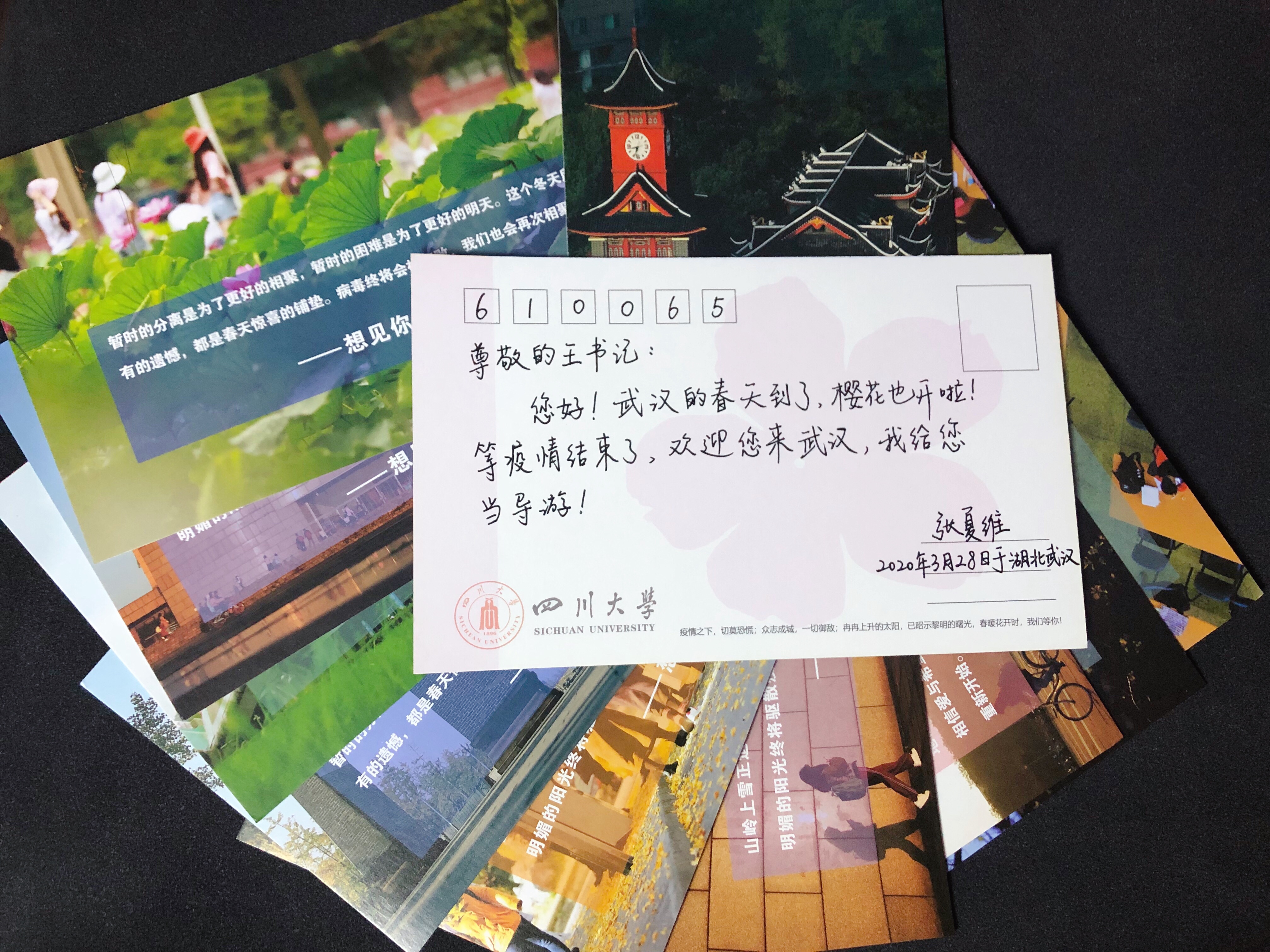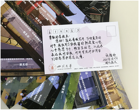 疫情发生以来,川大师生的健康和平安,是学校最大的牵挂,身处疫情中心的湖北学子更是学校关心的重点对象。全校师生一直记挂着湖北的川大学子们。前段时间,学校还特别为1754名湖北学生邮寄了抗疫爱心包,在收到爱心包后,同学们纷纷在学校邮寄的明信片上写下发自肺腑的文字,并推荐武汉的张夏维和张楷旸两名同学代表大家向学校表达感恩之心和思念之情。