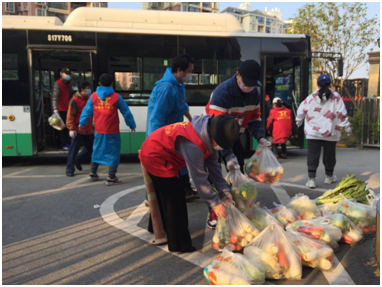 外国语学院武汉籍本科生李佳逸家的家人在自家餐厅为抗疫一线的工作人员无偿提供并配送爱心餐,李佳逸承担起后勤工作,还积极参加社区物资统计工作,帮助工作人员将全国各地支援武汉的蔬菜发放给周边买菜困难的居民。