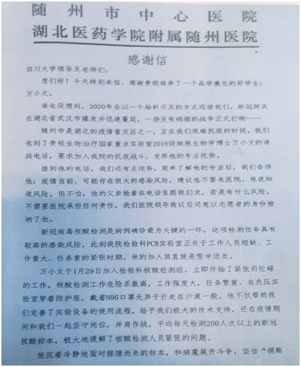 生物治疗国家重点实验室2018级细胞生物学博士研究生万小文,主动请战加入处于疫情重灾区——湖北医药学院附属随州医院的抗疫战斗,发挥自身专业优势,深入到危险系数高、工作强度大的核酸检测组工作。在领取到国家给医护人员的生活补贴后,万小文希望把这些钱都捐给医院,医院婉拒了他的好意,医院的有关领导表示“万小文在疫情中勇于担当、不计回报的精神令人感动”。