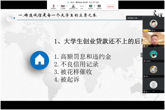 讲座从诚信对大学生的重要性,疫情下的诚信教育,揭秘金融骗局,诚信创造财富四个部分开展。刘琛老师首先就近期疫情下的瑞幸咖啡公司财务造假事件引发同学们关于诚信重要性和失信后果的思考,提到与大学生有关的诚信问题,刘琛老师讲到了大学生贷款,大学生常见失信行为和银行端征信情况。大学阶段是走入社会的过渡期,拥有良好诚信品格的大学生才能在社会上持有立身之本,刘琛老师强调了大学生失信会带来种种恶果,同时,也可积极采取增信措施进行个人诚信体系建设。