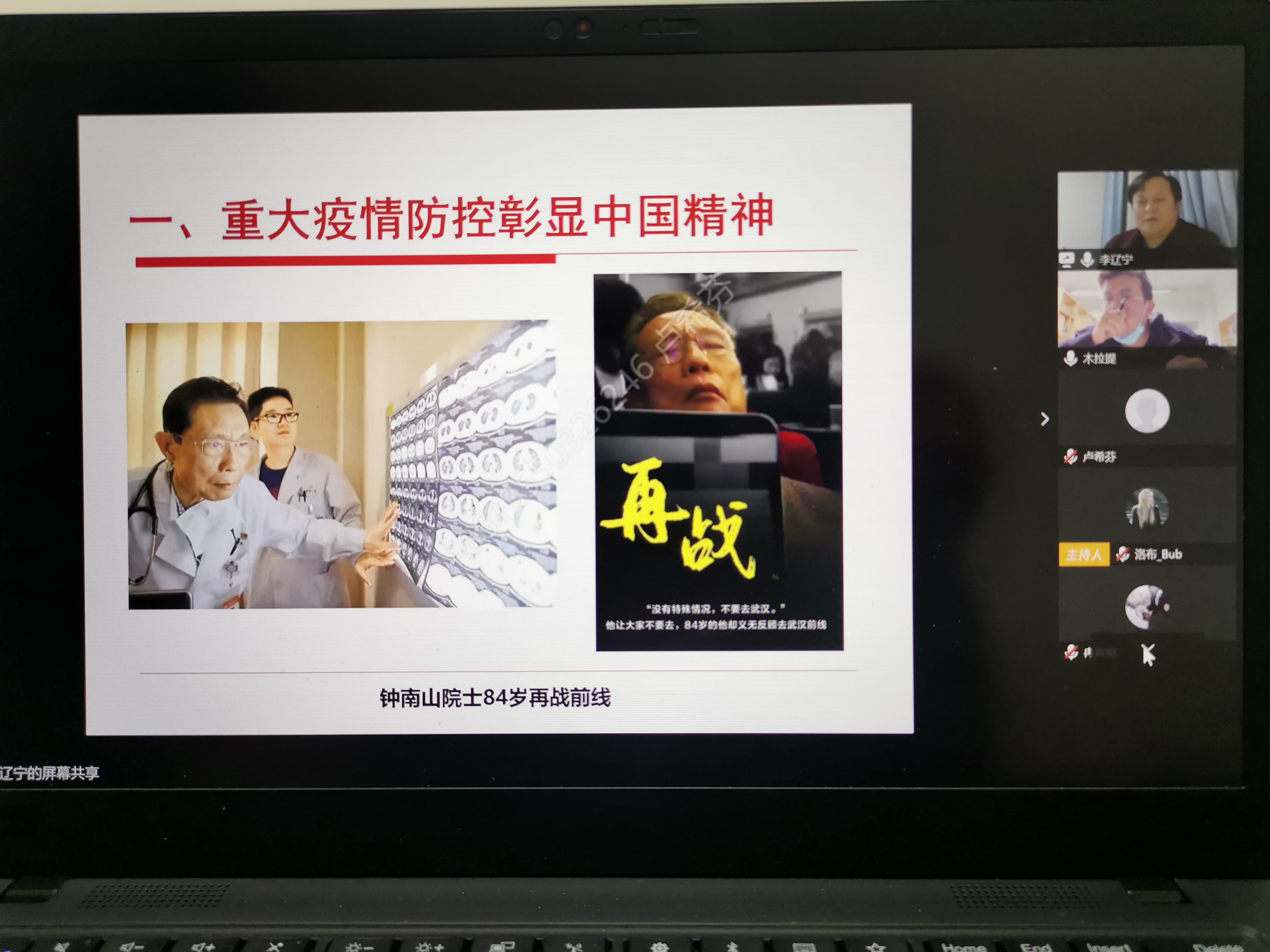 一位怀抱孩子的丈夫守望妻子吃水饺,逆行武汉的钟南山院士餐车上的小憩,金银滩医院张定宇院长带病战斗,拔地而起的火神山、雷神山医院,武汉的封城、全国的封路……李辽宁教授结合一张张图片故事的讲述,告诉同学们,中国精神就是以爱国主义为核心的民族精神和以改革创新为核心的时代精神。李辽宁老师说,此次疫情防控中,把人民生命安全和身体健康放在首位、新冠肺炎治疗由国家全免费、三度调兵增援武汉,一系列“以人民为中心”的强力举措都见证了中国力量。李辽宁教授还联系马克思主义理论从“党和人民群众心连心”“军民鱼水情”“党的集中统一领导”“集中力量办大事”等角度出发分析了重大疫情防控彰显的中国制度优越性,让同学们深切体会到党领导人民抗击疫情的理论高度和实践温度。