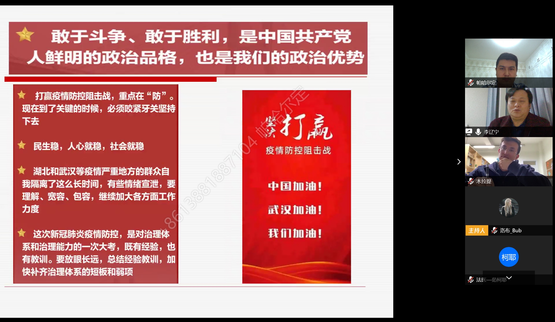 疫情防控期间,为加强对少数民族学生的关心关爱工作,我校在关注少数民族学生身心健康、学业就业、经济困难的同时,注重学生理想信念的引领和爱国主义的培养。2020年3月29日,学生工作部邀请身在武汉的我校马克思主义学院李辽宁教授线上为同学们上了一堂题为《重大疫情防控彰显中国精神和中国力量》的思政课。学工部江安办副主任卢希芬、民族学生事务办公室老师、资助中心办公室老师、内派教师、少数民族学生代表和全体预科班学生聆听了课程。