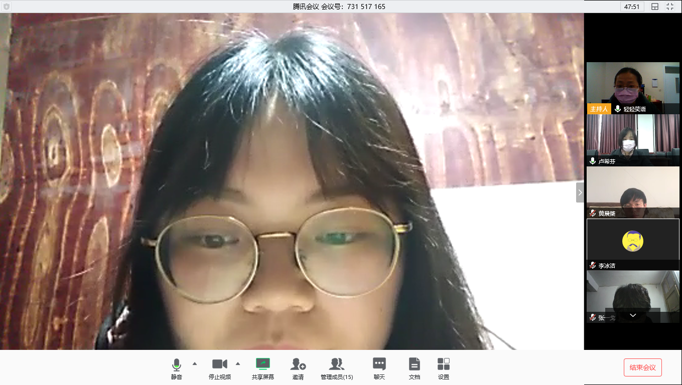 认真倾听了12位同学的发言后,学工部副部长卢希芬动情地说:“听到同学们的学习生活和抗疫故事后,我很感动,希望同学们继续保护好自己,在这场疫情防控阻击战的大考中取得优异成绩。”她还鼓励同学们说,“危”和“机”相生相伴,经历灾难后,同学们能面对困难学会微笑,面对挫折学会坚强,面对挑战学会勇敢,更要向战斗在一线的医护人员一样,做一名有能力、有责任、有担当的川大学子。