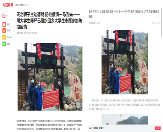 水利水电学院2019级104班本科生陈严发现村寨防疫形势严峻时,主动邀请回乡过年的6名大学生组成志愿小分队,到当地基层组织和所在旅游景区“请战”,毫不犹豫地加入到一线抗疫斗争中。志愿小分队参与防疫通告发放与张贴、到村部体温测量点执勤、疏导禁行景点游客、为公共场所消毒。陈严己参与轮班执勤8班次,测量体温63人次、发放张贴公告70余张、自筹发放口罩150个,金银花40余斤、劝导红事延期3起,白事从简1起、劝散聚众打牌1起、参与公共场所消毒1处。陈严己及其志愿小分队的事迹在当地引发了强烈反响,并被今日头条、湖南日报“新湖南”等主流媒体平台所报道。疫情过后,他最希望的,就是向党组织递交入党申请书,争取早日成为一名光荣的共产党员!