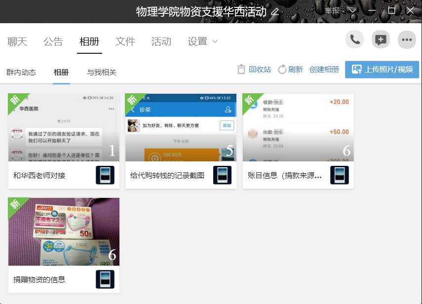 1月26日,物理学院2019级物理学专业部分班级的班委成员们组织班级同学自愿捐款募集用品支援华西医院,并在辅导员老师的指导下成立了“物理学院物资支援华西活动负责委员会”。班委们撰写活动倡议书,开展物资对接和善款管理的工作,克服重重困难与美国、新加坡、马来西亚和日本等地校友反复沟通后,最终找到了合适的口罩货源。为期一天的活动,共计筹集善款人民币2670元,通过海外渠道购买了医用外科口罩800余只,均悉数向华西医院顺利送达。