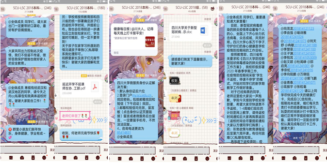 除此之外,辅导员老师们还带上了专属助手小薇——川大微服务,微服务上“健康每日报”也是他们疫情期间日常提醒工作之一。“同学们记得上报今日信息”、“今天,你打卡了吗”等等话语成了老师每日最多发言,一个个QQ群的“龙王”辅导员应运而生,而老师们关切的心始终如一。