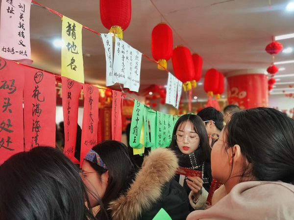 在游园活动现场,既有极具挑战性的知识问答、跳房子,又有颇具年味的剪纸、猜灯谜、写春联,还有好玩的闭眼摸福和套圈圈,同学们纷纷参与其中,既益智又有趣,同学们在游园中重拾儿时过年的记忆。