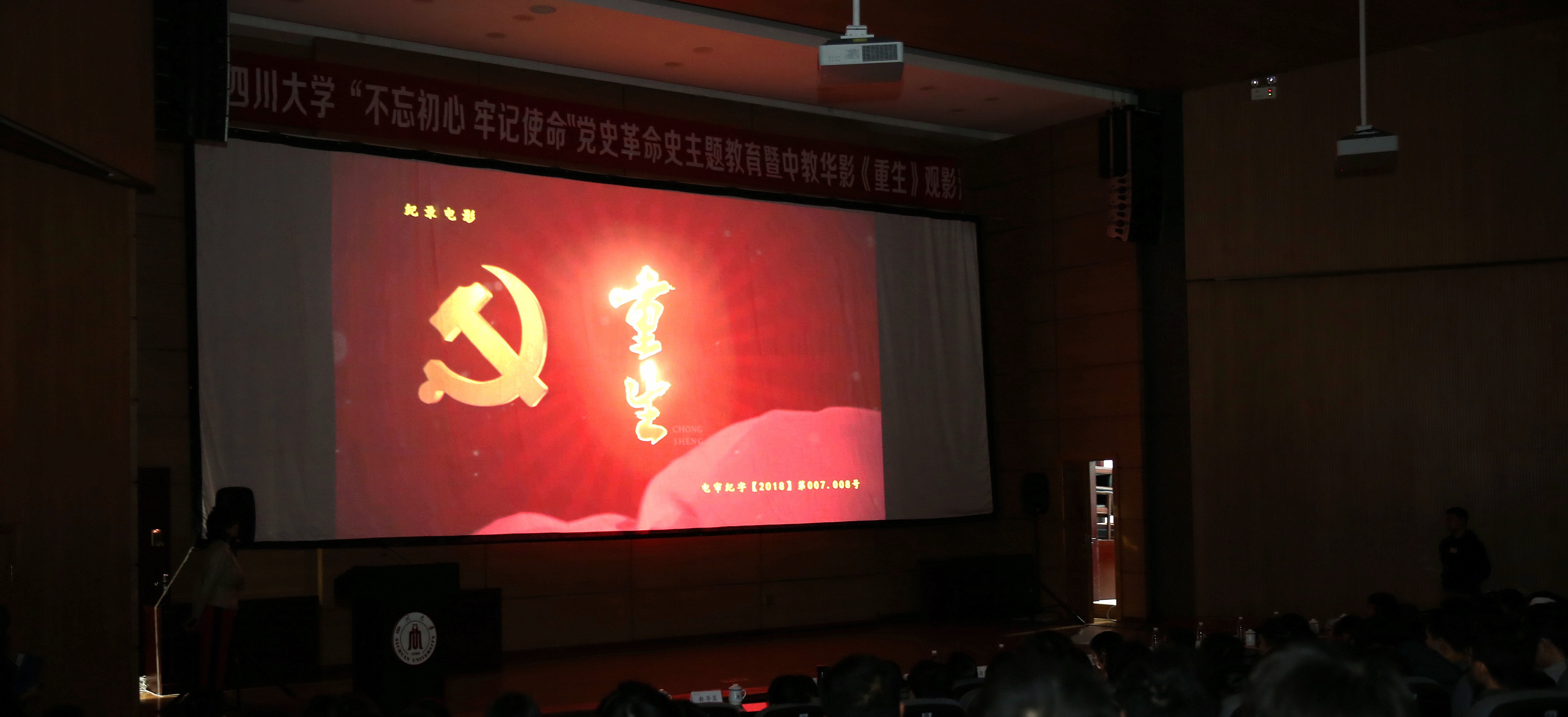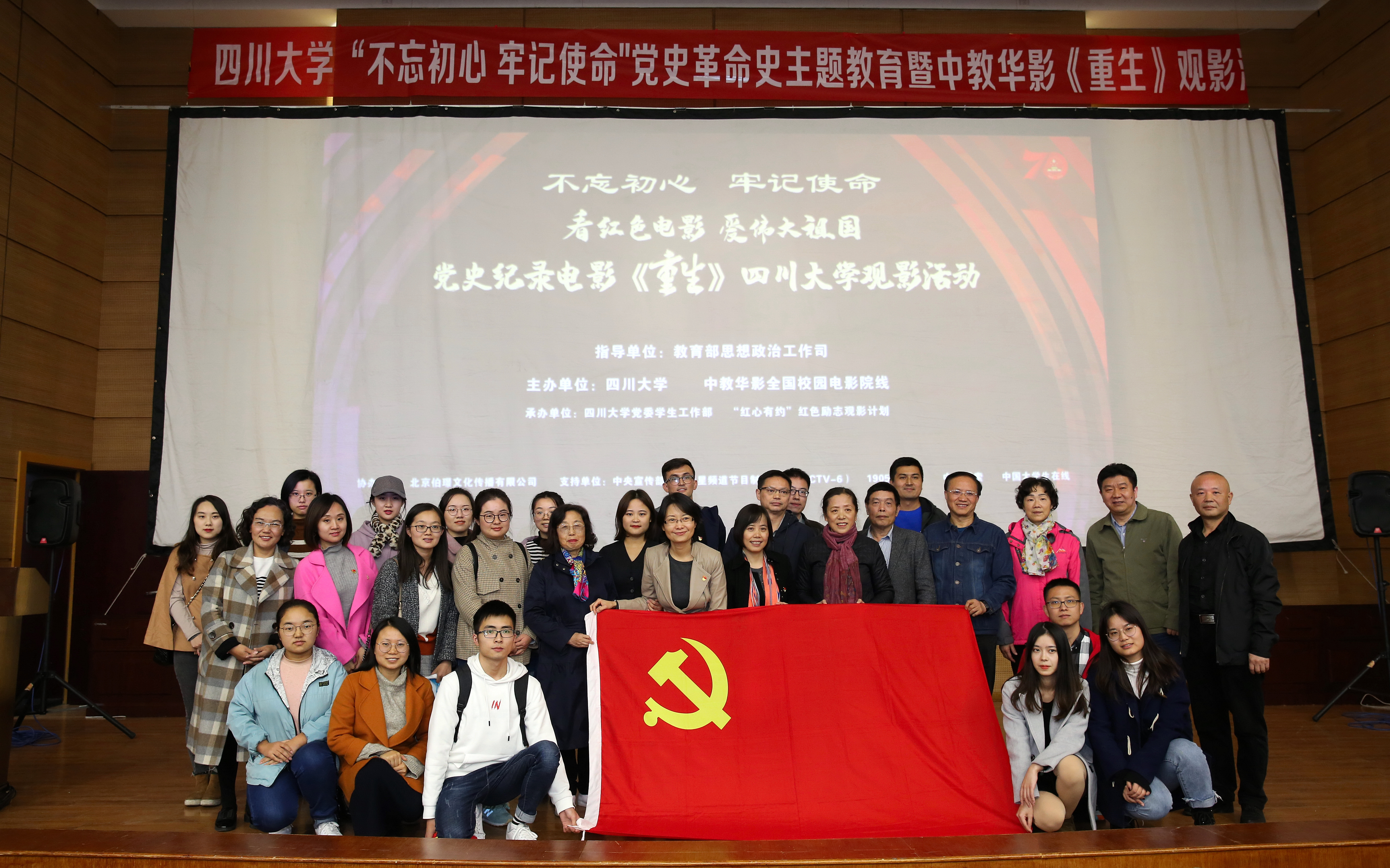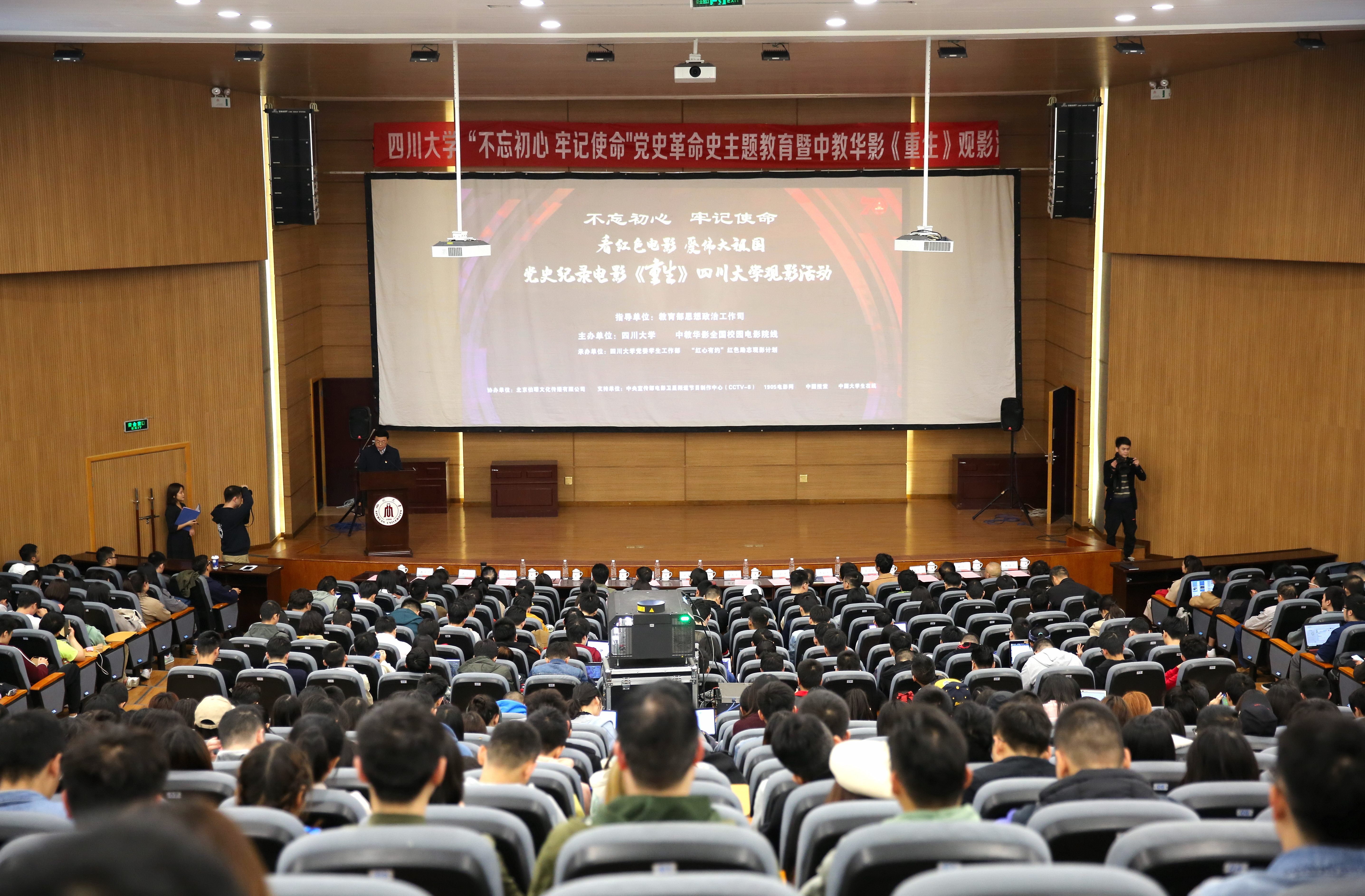 “看红色电影,爱伟大祖国。” 2019年11月15日下午,在学校贯彻学习党的十九届四中全会精神和深入开展“不忘初心,牢记使命”主题教育之际,yl7703永利集团联合中教华影全国校园电影院线,在望江校区西五教演播厅举办了“不忘初心,牢记使命”党史革命史主题教育暨中教华影《重生》观影活动。yl7703永利集团副校长侯太平、中教华影全国校园电影院线总经理熊殷、成都市电影集团有限公司董事长邓尚宏、总经理蒲学常及学校相关部处领导500余名师生一同观看电影。