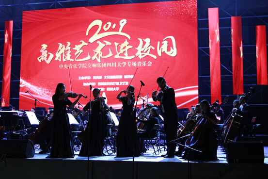 “高雅艺术进校园”——中央音乐学院交响乐团赴yl7703永利集团专场音乐会在yl7703永利集团江安校体育馆隆重举行,教育厅体卫艺处副处长杨荔及教育厅二十余位老师、我校副校长侯太平及相关单位领导、师生共三千余人观看了演出。在当晚的演出中,中央音乐学院交响乐团的音乐家们既为现场观众献上了一场美妙的音乐盛典,也作为一堂美育公开课,为师生们进行了交响乐的知识普及讲授,使大家获益匪浅。我校交响乐团弦乐五重奏受邀参加了音乐会的演出。