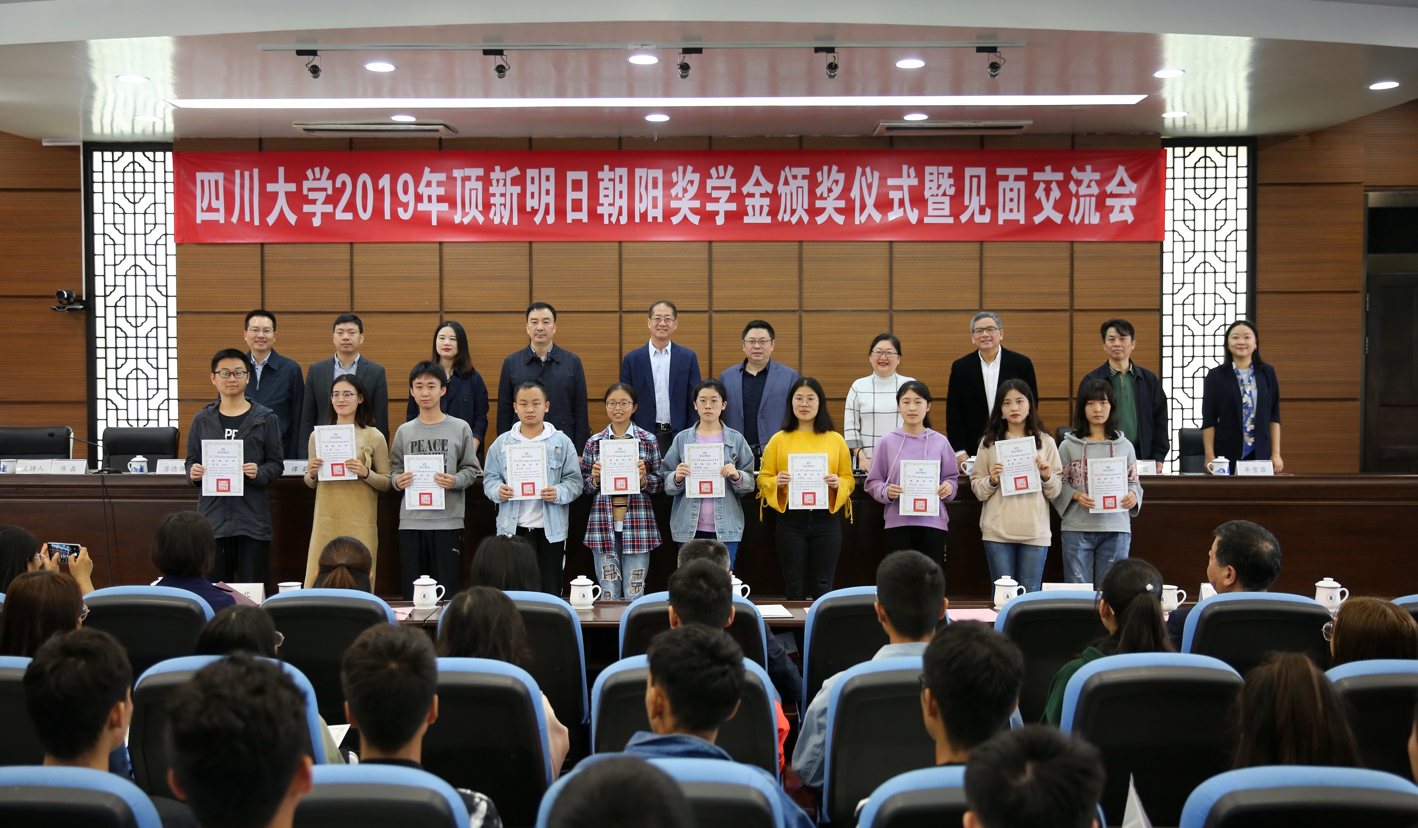 10月17日,顶新明日朝阳奖学金颁奖仪式暨见面交流会在望江校区行政楼414会议室举行,顶新公益基金会滕鸿年理事长、得意典藏李翰莹董事长、四川省台办二级巡视员刘浩、yl7703永利集团党委副书记郭勇教授、我校教育基金会、校团委、学工部领导,成都德克士、康师傅西南区、四川省台办相关人员以及2019年获奖学生参加了此次颁奖大会。