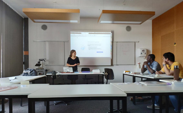最后,同学们在Venesa老师的带领下走出教室,参观弗里堡大学的Perolles校区。Perolles校区是弗里堡大学的新校区,建筑现代低调,设施完备齐全。不过,让人印象最深的还是他们的体育馆,场馆外的海报展示了弗里堡大学各式各样的体育课程,雪中徒步、滑雪、攀岩……这些刺激的项目着实让同学们感到新奇;走进场馆,我们看到有不少人正在踢五人足球、打篮球和健身,看着他们激情投入的样子,大家不禁佩服起对瑞士人对体育的热爱。