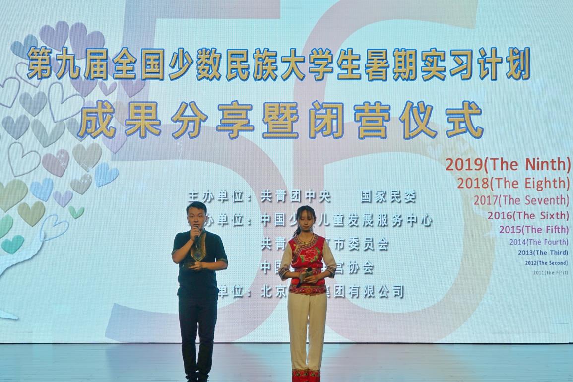 为贯彻落实习近平新时代中国特色社会主义思想和党的十九大精神,落实中央关于加强少数民族大学生就业工作要求,深化民族团结进步教育,铸牢中华民族共同体意识,加强各民族交往交流交融,2019年7月19日-8月17日,来自全国各地的244名少数民族大学生参加了由共青团中央、国家民委共同主办,中国少年儿童发展服务中心、共青团北京市委员会、中国青少年宫协会共同承办的“第九届全国少数民族大学生暑期实习计划”,在中国青年报、中国通用技术集团、北京汽车集团、应急总医院等73个中央部委所属企事业单位和北京市企事业单位开展了为期一个月的实习工作,我校9名同学分别就职于中国青年出版总社、中国国家图书馆、中国建筑第二工程局有限公司等单位。活动主办、承办方除了帮助少数民族大学生对接实习岗位,还开展了团队训练、参观考察、企业家面对面、职业生涯发展培训、总结分享等丰富多彩的活动,促进学生交流、增进民族情谊、感受新中国成立70年以来的发展成就,帮助少数民族大学生提升就业能力,为学生们提供了一段精彩的暑期实习生活。