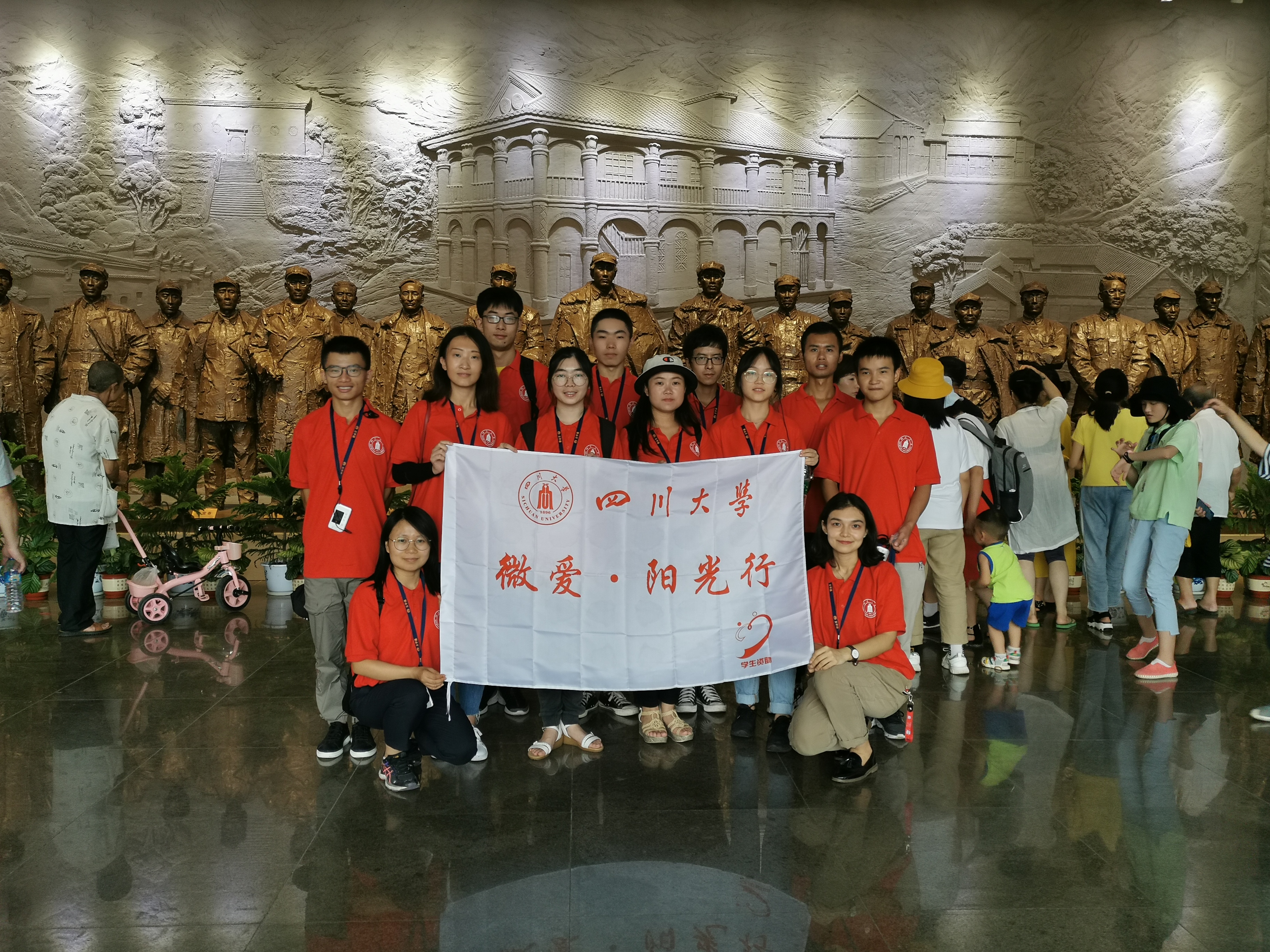 为纪念新中国建立七十周年,弘扬伟大的长征精神,培育家国情怀,深化资助育人,学工部于2019年7-8月通过“微爱·阳光行,重走长征路”社会实践活动,将爱国主义教育和资助育人工作相结合,激发川大学子不畏艰难、脚踏实地,奋发拼搏走好新时代的长征路。此次活动由21名带队老师和109名学生志愿者组成16支队伍,行程22779公里,足迹遍布长征沿线及新疆、西藏51个县区,走访357名学生家庭(其中在校生293名,新生42名,毕业生22名),发放慰问金195500元,在家访的同时,志愿者们也将“微爱?阳光行”的印记深深烙在红军长征土地上。从江西于都的长征第一渡至贵州的遵义会议会址,从四川的会理会议旧址到云南的会泽扩军生态园,再从贵州的川滇黔革命委员会旧址辗转至最后的会宁会师纪念塔,志愿者团队遍迹9处红色纪念遗址。