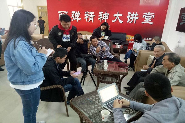 图/两弹城内采访现场(图中两位老人从左到右依次是九院研究员陈俊祥、林银亮)