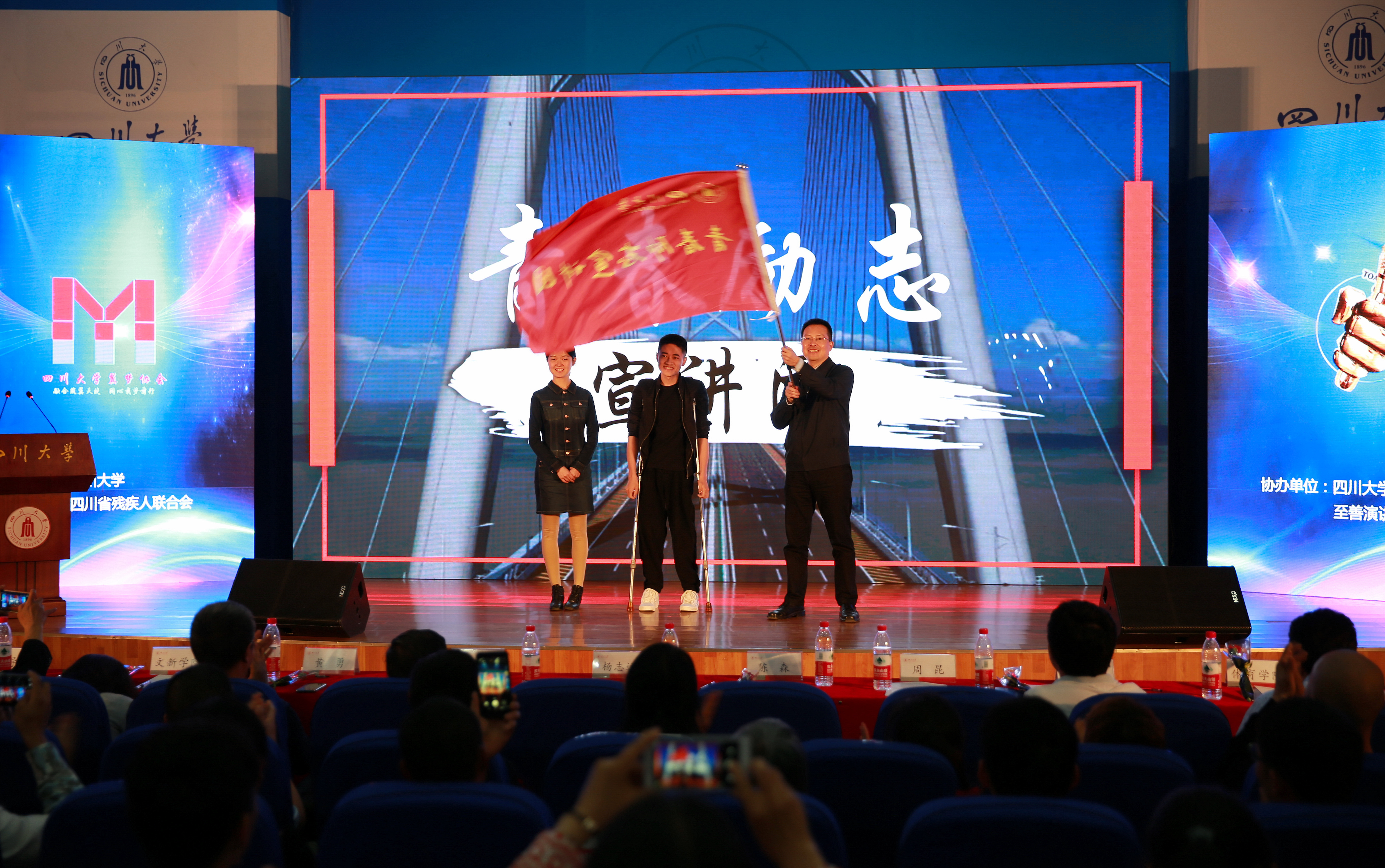 为激发同学们的奋进潜力,呼唤大家在新时代的担当和责任,增强学生的家国情怀和人类关怀,由残健融合青春励志演讲比赛获奖学生组成的“青春励志宣讲团”在现场举行了成立和授旗仪式,上届获奖选手文学与新闻学院2017级肖威搏同学和本次比赛一等奖获得者闫然同学从陈森部长的手中接过了“青春励志宣讲团”的使命。