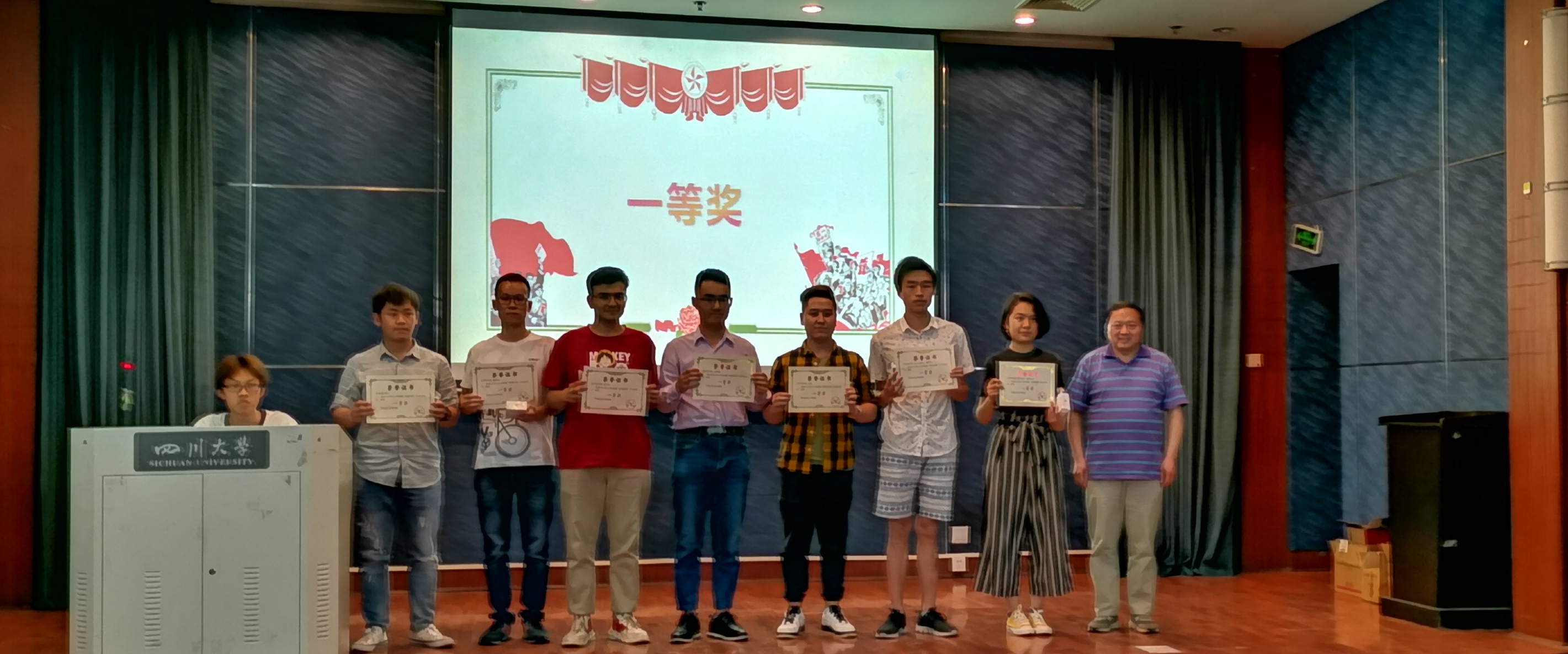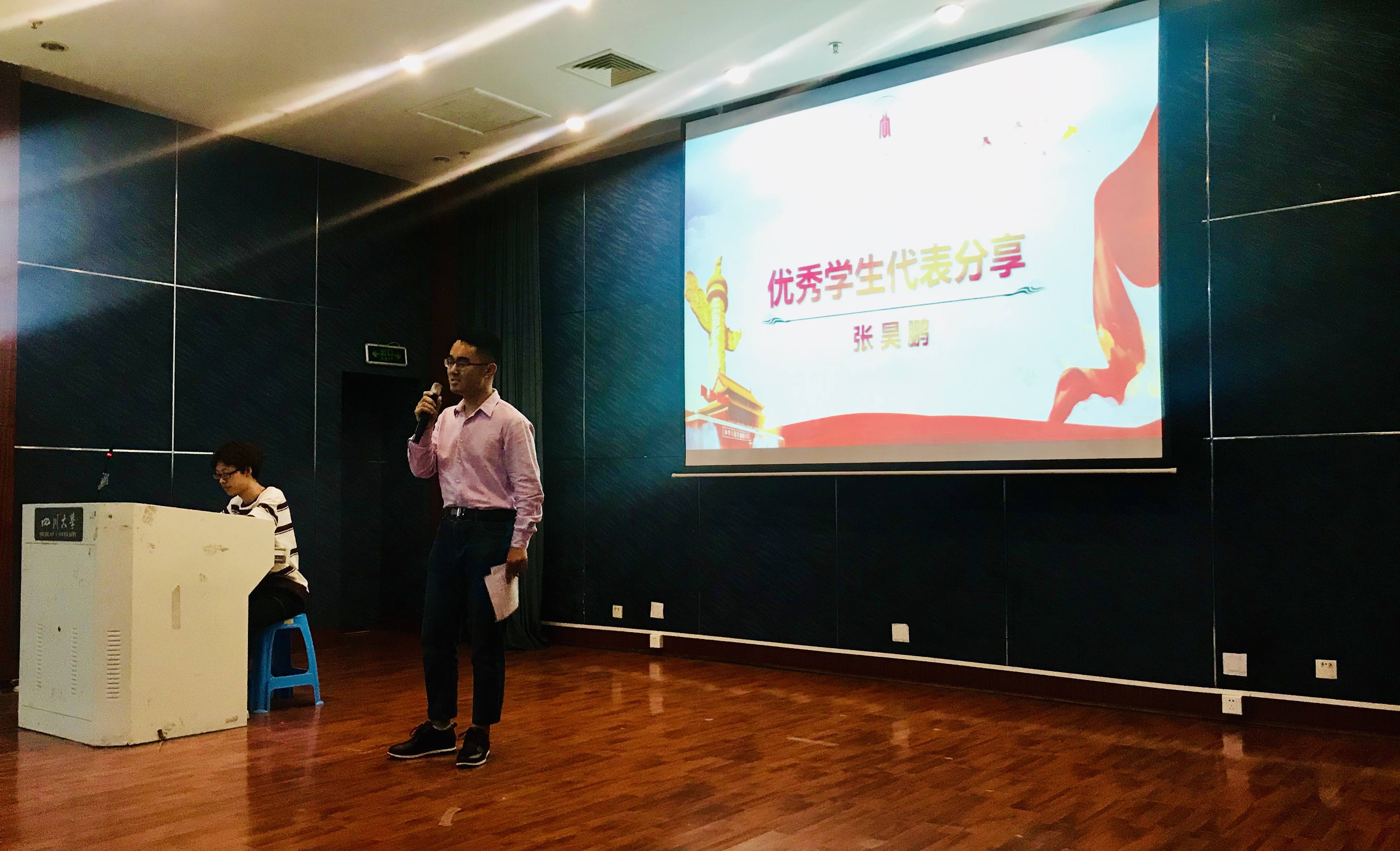 优秀学生代表张昊鹏、柳祥雲、伊孜孜江纷纷上台讲述他们在寒假中的活动经历,他们以川大学子的努力实践表达了对家乡浓浓的情意。张昊鹏详细介绍了他的家乡“中共第一城”——山西省阳泉市,并用镜头下的照片带领我们走入这座在战场上诞生的城市。“这里有天下第九关的雄壮,亦有百团大战纪念碑的悲怆”,张昊鹏讲到,“作为新时代的青年人,无论处于人生的哪个位置,卑微也好,强大也罢,都要有向上走的气魄,往下看的胸怀。” 柳祥雲的家乡位于长江之滨的重庆奉节,他说家乡经历了改革开放四十年的发展呈现出了崭新面貌,带着党和国家的关怀,他与同学走进高中母校,以自身求学经历为例,传播勤奋好学正能量,他告诉学弟学妹们:“无论是我们的学校还是国家,都会在我们需要帮助的时候站在我们身后,作为我们坚强的后盾,助我们走的更高更远”。来自新疆喀什的伊孜孜江深情地表达了这个寒假活动的深刻意义:“这不仅仅是简单的一次志愿活动,更是一节意义非凡的党课。”他带领由五十余名川大学子组建的团队深入基层,体验基层的变化,更加意识到自己肩上的使命和重任。最后他鼓励同学们要更加努力的学习,充实自己,取得更大的进步,才能有更大的成就做出一番事业,为实现中国梦添砖加瓦。
