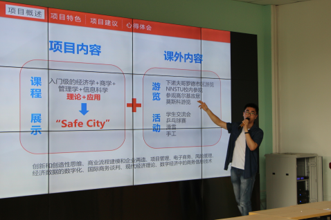 接着,肖天豪同学介绍到,俄罗斯下诺夫哥罗德国立技术大学是俄罗斯乃至欧洲知名的高等学府,更是中俄“长江—伏尔加河”高校联盟的俄方牵头单位。作为伏尔加联邦管区最大的技术大学之一,该校在核动力工程与应用物理学方面颇有建树。此次访学项目以数字经济与管理为主题,从商业流程建模、企业再造、电子商务、风险管理、经济数据的数字化等方面着重培养了同学们的创新和创造性思维。通过肖天豪对他们小组结课成果“Safe City”的详细介绍,同学们对于如何将课堂上的理论知识与现实需求相结合有了更深刻的理解。课程之外,他们也同样体验了城市文化,参观了高尔基故居、克里姆林宫等景点,与俄罗斯同学开展趣味乒乓球赛、体验滑雪,这都给大家留下了精彩美好的回忆。同样,肖天豪在最后也给出了他的出访小tips,他建议出访前团队成员明确分工,分块负责,多从网络上收集出访相关信息、当地衣食住行情况、校内校外手续办理流程等等,以便高效做好更充分的准备。