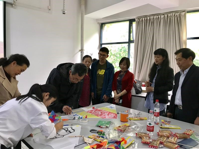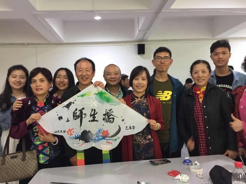 最受欢迎的一顶风筝来自刘蓉生老师一组,“师生桥”三个苍劲有力的毛笔字题在筝面中央,配上黑红蓝绿黄五种不同颜色描绘出的花草鱼兽,颇有国画写意之风。大家以此表达了迎接春天、珍重春光的心情,又通过亲手制作更深地感知了风筝这一祖国非物质文化遗产。