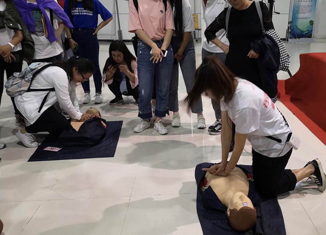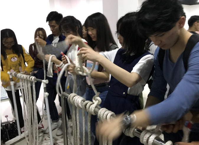 防灾自救区以互动体验为主,旨在让参观者在“演练”中认识灾害,掌握自救互救技能。在学习过程中,同学们紧紧围在讲解员周围,仔细聆听着实施心肺复苏术的要点与细节,并模仿其动作给假人实施心脏复苏救援;其后,同学们学习消防绳结,双套结、称人结这两种打结更加安全稳定牢固,有利于在灾害发生时进行逃生与自救,在日常生活中也十分实用。