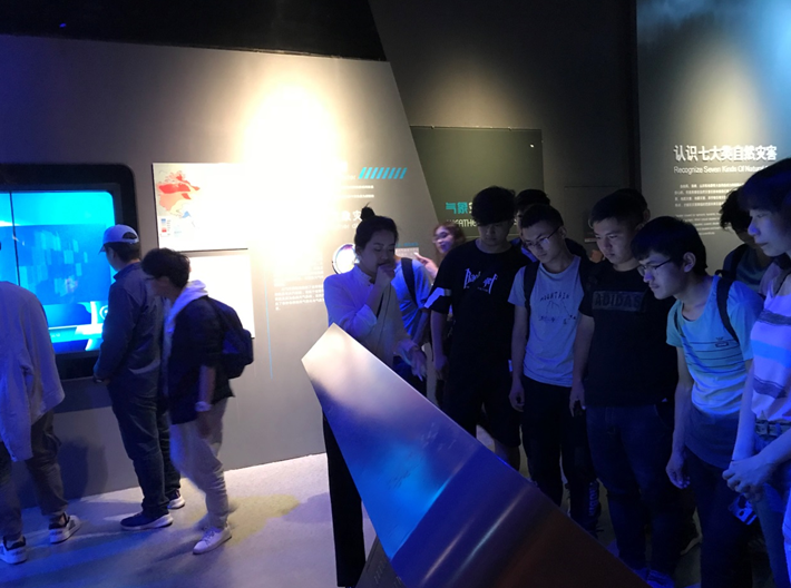 穿过宣传长廊,同学们首先来到了认识灾害区。讲解员具体详细的解说地震、地质、森林、洪水和海洋等七类自然灾害的基本知识和人类活动造成的灾害,并通过展区内高科技技术形象生动地还原了泥石流,洪水等来临时的情景,这让同学们身临其境地感受到了自然灾害的突发性与破坏性;在小剧院,师生们一同观看科普影片,丰富的动画讲解让大家对四川灾害频发的原因有了进一步的认识;此外,地震波模拟装置更是直接性的展示了纵横地震波的不同强度和其导致的危害程度大小,同学们积极参与,动手实践。