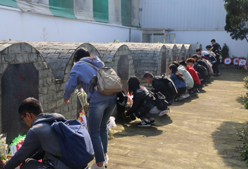“离开时你们都是风华正茂的少年,可是归来之时却成了英雄”;“通过此次扫墓,我懂得了要珍惜来之不易的生活,要像先烈们一样有大无畏的精”神,用行动去纪念他们”;“感觉第一次离建设国家的先驱们这么近。以后我想不管怎么发展,国永远在我心中”;“斯人已逝,而他们奉献自我,积极投身复兴祖国事业的精神却永远长留我们心中,并且激励一代代中国人心怀热血,报效祖国”; “一腔热血勘珍重,洒去尤能化碧涛”……九顶山蒙难烈士墓没有高大的山,没有翠色的草,没有烂漫的山花,但有同学们在清明祭扫的恭敬肃穆中敬畏历史,护卫国魂。