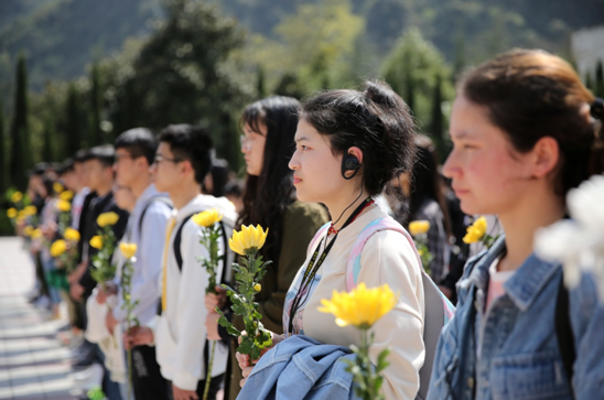 来到漩口中学遗址,师生面对定格的时钟和塌陷的主教学楼向地震罹难者默哀,并在汶川特大地震记事墙前敬献鲜花。随后,在导游的带领和讲解下,同学们透过完全坍塌的女生公寓、从五层变为四层的男生公寓、倒塌扭曲的教学楼仿佛看到了一位母亲与两位怀孕的女儿的身影,一位羌族老师和一位汉族老师在生命三角区互相鼓励坚持三天获救的故事,还有那些冒着风雨和余震坚持救援的英雄们……汶川特大地震记事墙以文字记载了大地震灾难和抗震救灾的事迹,浮雕则真实再现解放军战士及医护人员运送伤员上飞机的场景,展现全国人民万众一心,众志成城,团结一致,夺取抗震救灾重大胜利的信心。