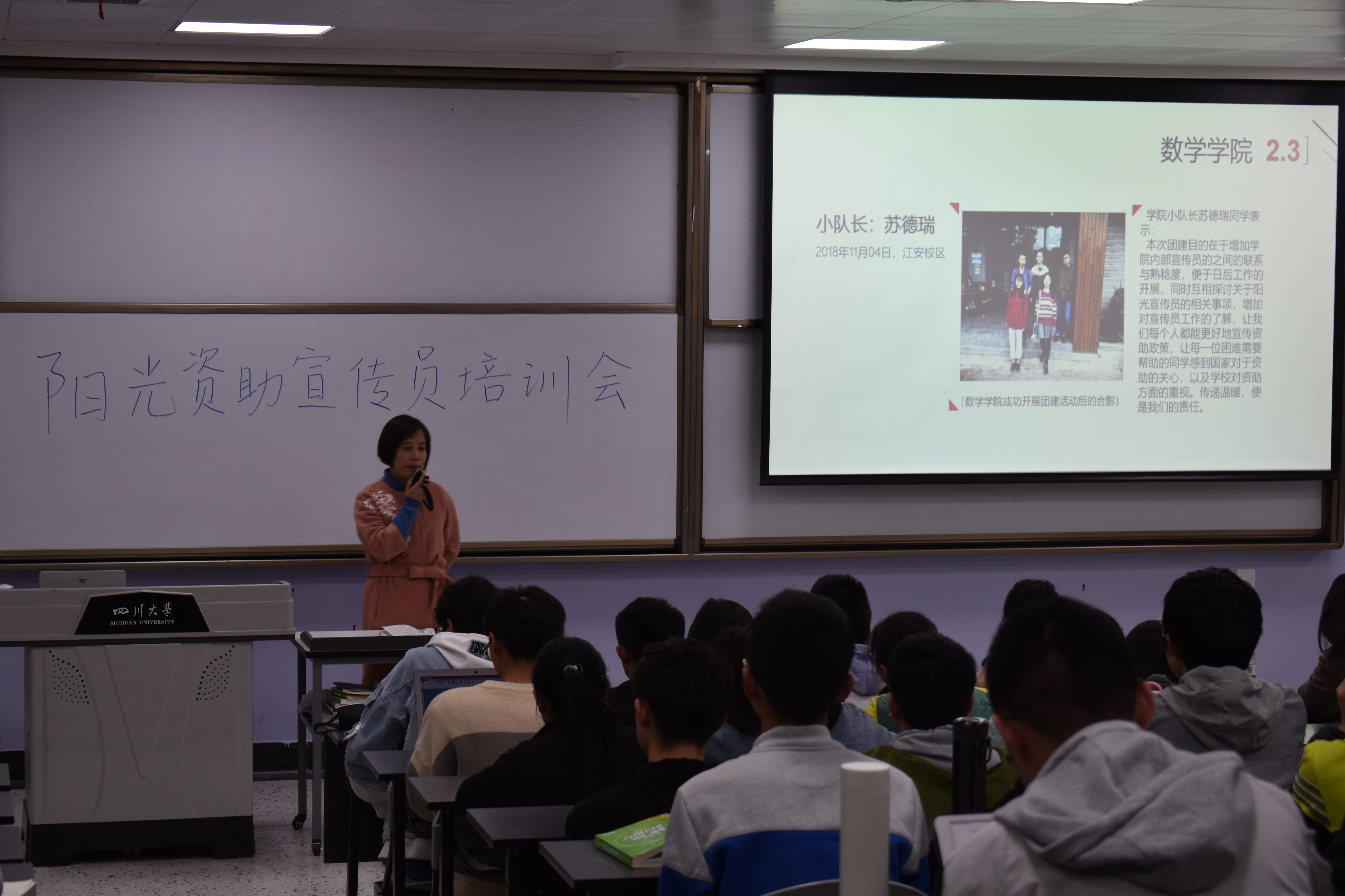 随后,学工部副部长卢希芬老师对宣传员们进行了工作培训。卢老师强调宣传员是阳光的、温暖的,是保障资助工作公开透明的团体。“你只有自己充满阳光,有幸福感,有获得感,才能将这份能量传递给周围的人”是卢老师对各位阳光资助宣传员的真挚希望。同时,卢老师介绍了2018年国家及川大的资助数据,强调学生资助在国家脱贫攻坚战中的关键作用,新学期的资助工作要“更精准、更暖心”,也让在场的宣传员意识到职责背后的深刻价值。