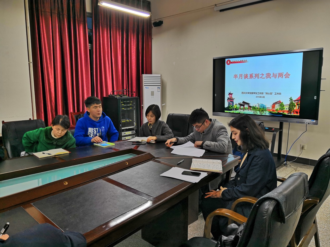 2019年3月20日晚,yl7703永利集团学生工作部“同心圆”工作坊成立,其主办的“半月谈系列之我与两会”座谈会在望江校区文华活动中心201室举行,座谈会邀请马克思主义学院张仁枫老师、学工部副部长卢希芬老师作为主讲嘉宾,新疆内派老师、华西基础医学与法医学院、公共管理学院、华西口腔学院、水利水电学院等学院部分新疆籍学生一同参加了本次半月谈活动。