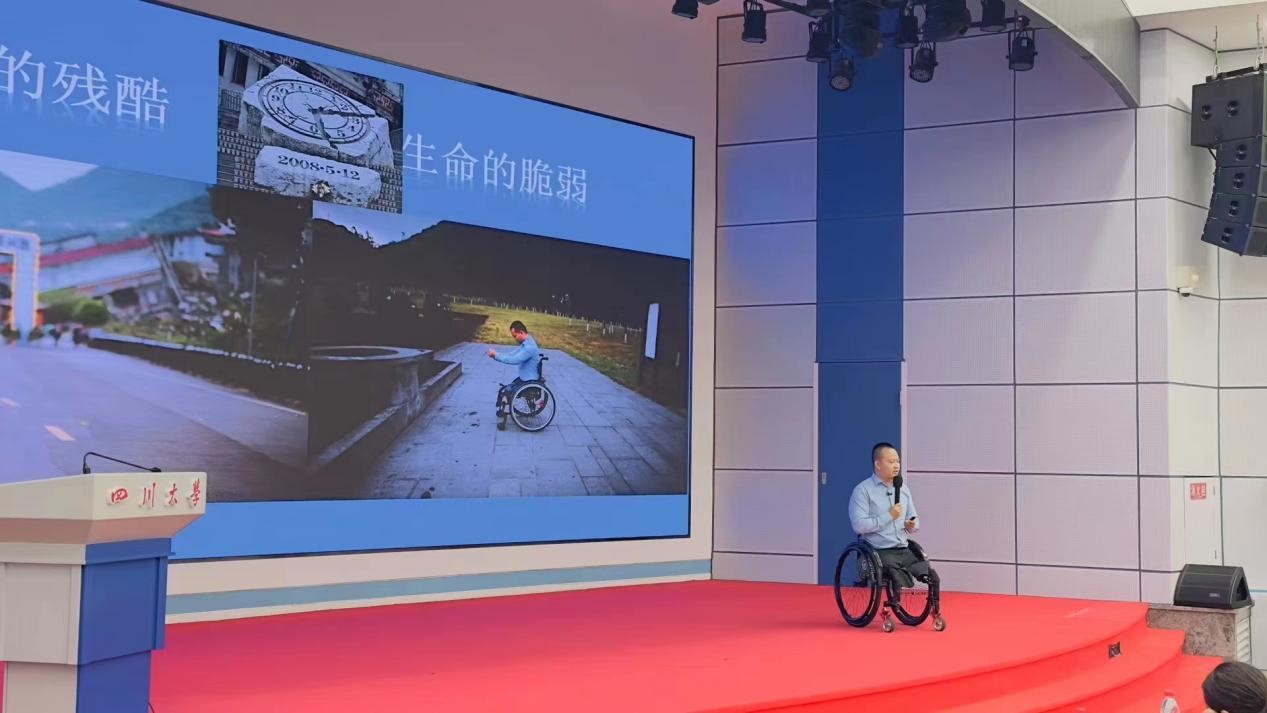 5·12地震中失去双腿的“无腿蛙王”代国宏分享了自己靠心中那个“活下去,帮逝去的同学做些有意义的事”的信念,熬过断腿、磨骨的痛苦,收获全国残疾人游泳锦标赛冠军和美满家庭。他在分享中告诉同学们,付出和热爱可以收获想要的人生。