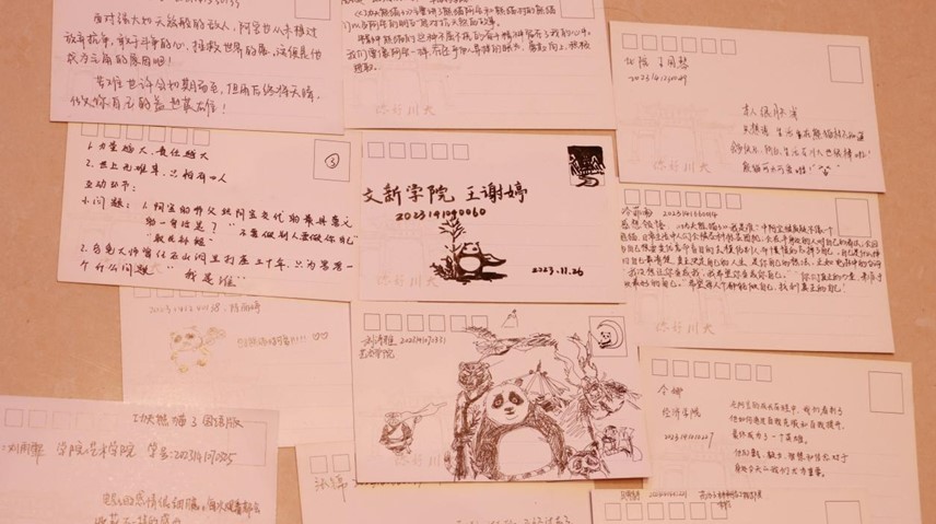字字书情,笔笔从心。明信片清晰地记录下观众观影时的感动瞬间:《功夫熊猫3》中阿宝被质疑不像一个熊猫!其实自己是什么样的自己最清楚,真正决定自己的人生的是你自己的想法。正如电影中的台词“我没想让你变成我,我希望你变成你自己。”希望每个人都能做好自己,找到真正的自我。电影中熊猫阿宝不屈不挠的奋斗精神留在了我的心中,我们要像阿宝一样,不在乎他人异样的眼光,勇敢向上,积极进取……