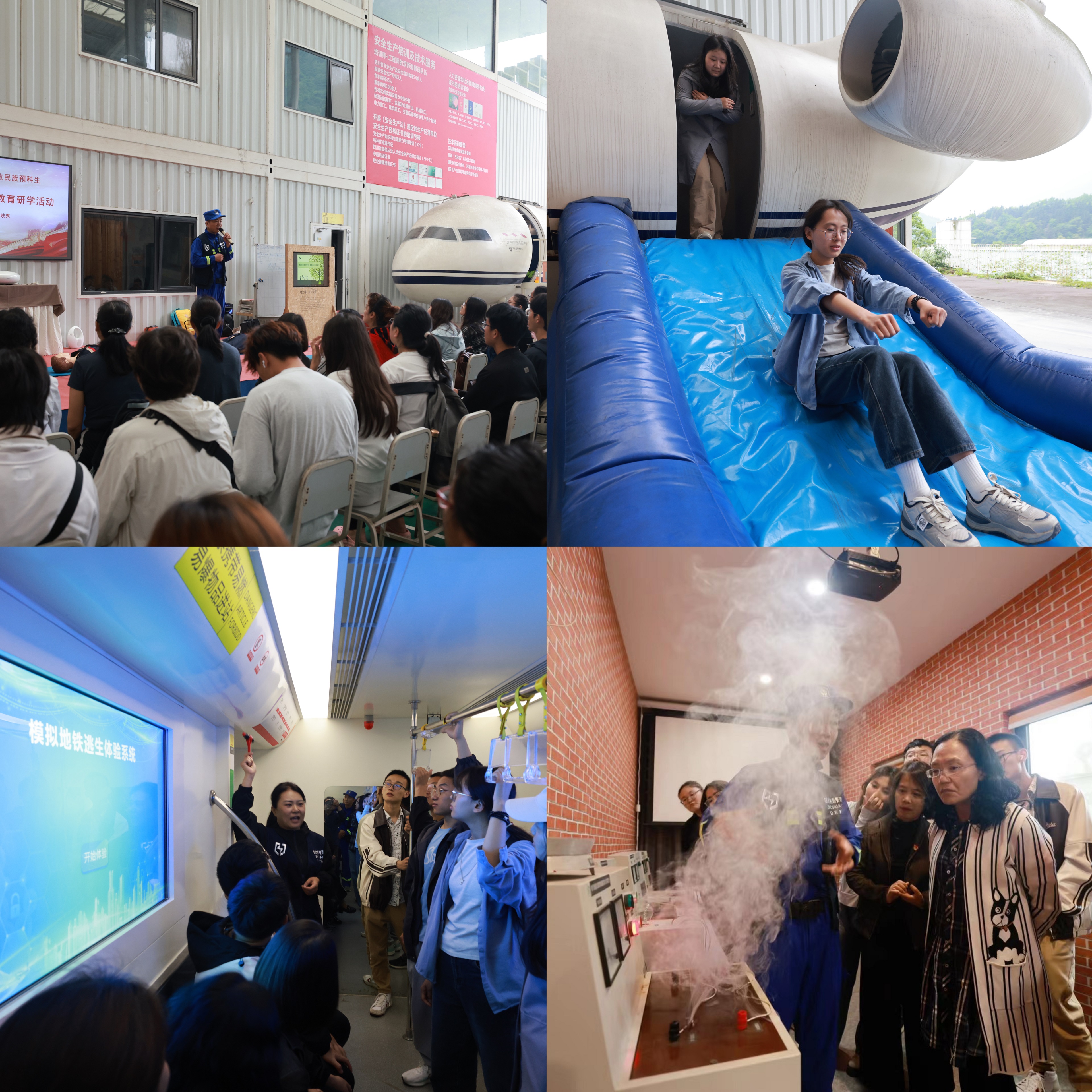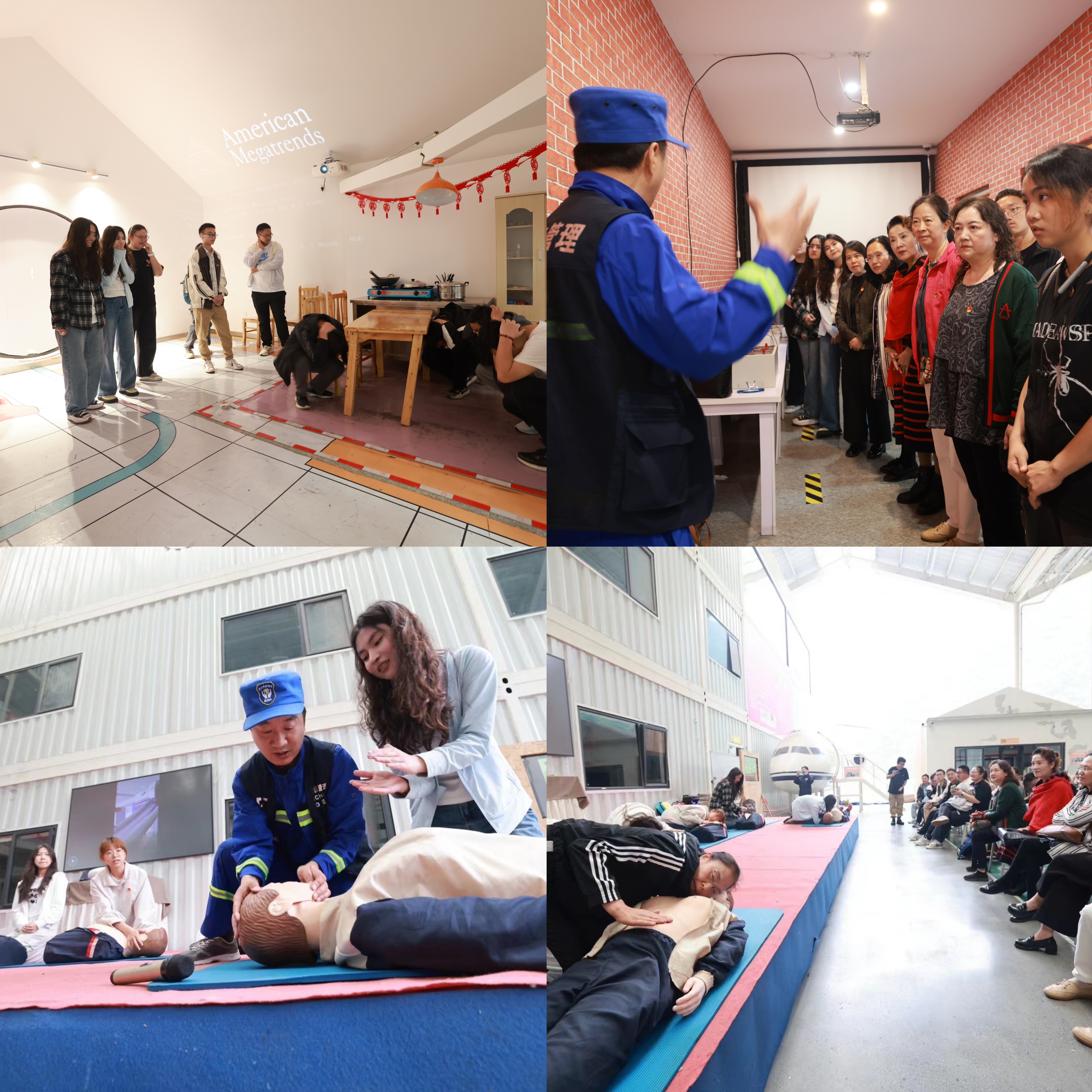 在城市应急体验中心,同学们在专业的应急救援员的指导下,学习了在不同场景下的地震自救方法、地铁火灾逃生方法、航空事故逃生方法、海姆立克急救法和心肺复苏方法等急救知识和应急技能。
