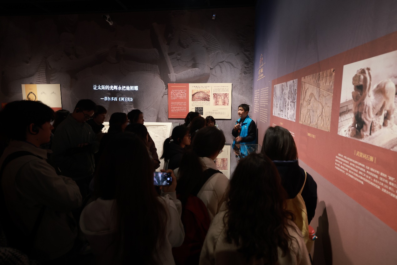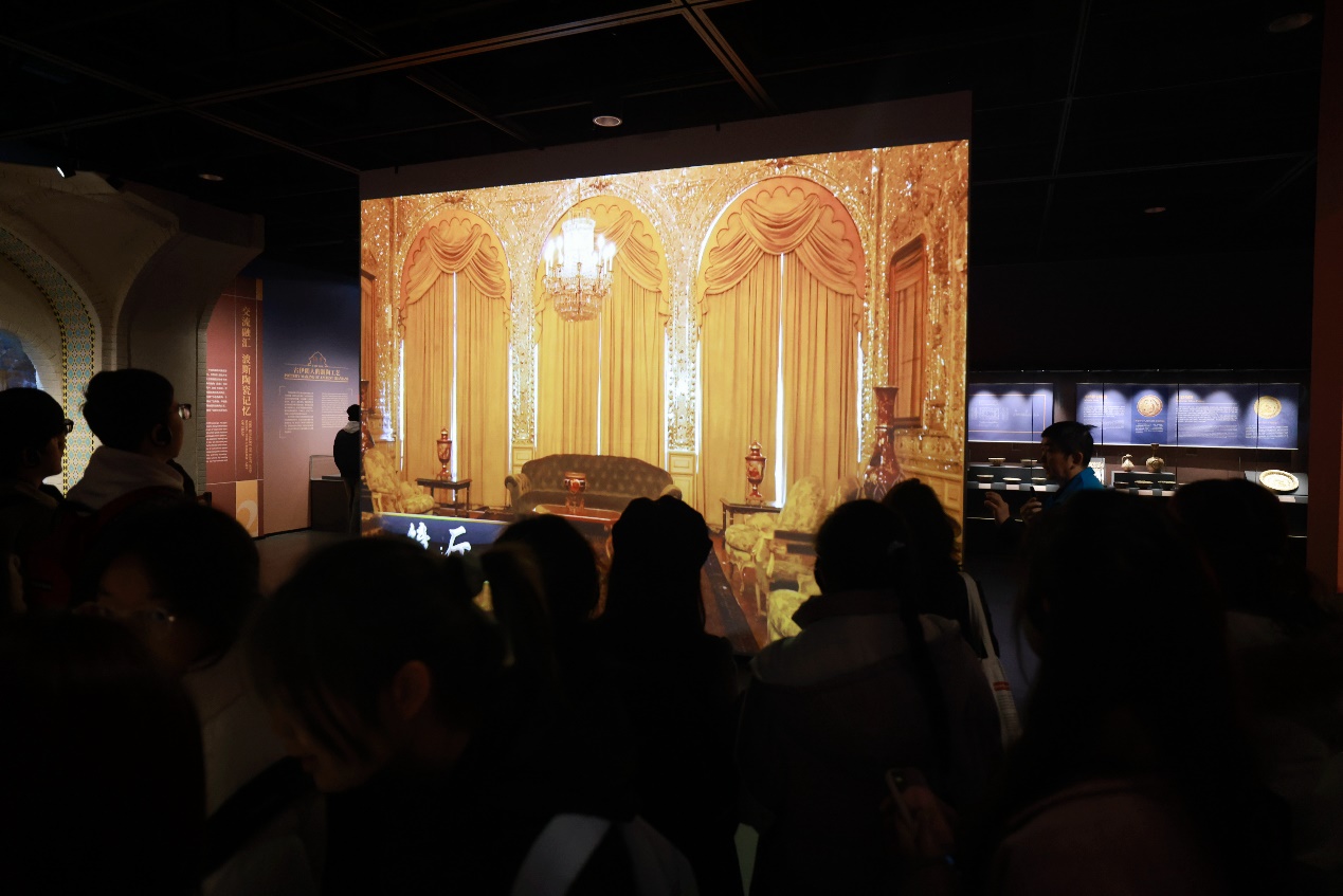 驼铃相闻,舟楫相望。沿着绵延万千公里的陆上和海上丝绸之路,两大文明远行并拥抱。来自新疆的同学感叹:“波斯地毯的几何图案让我联想到家乡的艾德莱斯绸,虽工艺不同,却都体现了对美的极致追求!”在参观过程中,同学们认真聆听讲解员的介绍,深入了解每一件展品背后的历史故事和文化内涵。釉色流转的波斯陶瓷、纹饰璀璨的金属器皿、色彩斑斓的玻璃制品、经纬交织的波斯地毯无不让同学们赞叹不已。这些展呈的文物,讲述多元文明美美与共的永恒主题,书写人类精神交相辉映的壮丽诗篇,为同学们带来一场精妙绝伦的视觉盛宴。