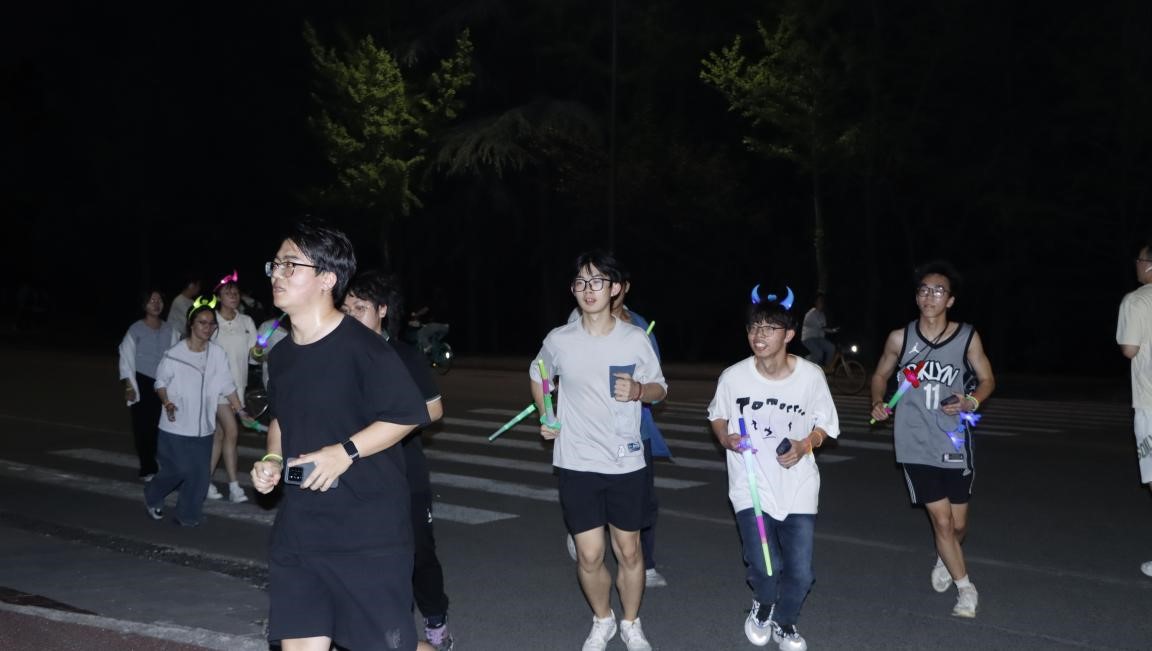 夜跑环节中,参与者按配速分组,每组由2名同学前后照应,保障安全并活跃气氛。队伍穿梭校园,荧光闪烁,青春活力随步伐尽情释放,队员间互助前行,友谊悄然升温。项目组摄影同学全程跟拍,定格奔跑的精彩瞬间。