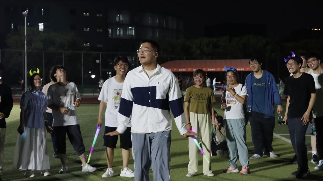 夜跑结束后,众人移步二号运动场,开启趣味十足的素质拓展互动。化学工程学院2023级彭曦、机械工程学院2024级马锐哲担任主持,组织多轮游戏。在音乐冻结舞中,同学们随乐舞动,音乐骤停时迅速摆出指定姿势;模仿动物跑姿,三支队伍化身“萌态动物”,姿态各异冲向终点;气球大作战考验团队协作,成员分工吹球、背夹运球,现场气球纷飞、笑声不断;猫鼠游戏中,“猫”“鼠”追逐,将气氛推向高潮。