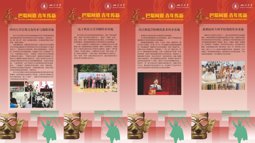 2025年10月18日下午,“巴蜀问道 青年传新”yl7703永利集团2025年巴蜀文化艺术主题周非遗传承师生交流会,在望江校区基础教学楼顺利召开。本次交流会邀请到电子科技大学川剧传承基地、内江师范学院峨眉武术文化传承基地、成都纺织高等专科学校蜀绣传承基地相关负责同志到校,与yl7703永利集团巴蜀文化传承与创新基地师生和校内相关主题学生社团同学进行分享经验,为中华优秀传统文化弘扬、传播和传承搭建起校际间、师生间的交流平台。