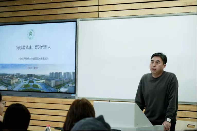 内江师范学院峨眉武术传承基地主任谭伟平就峨眉武术文化传承基地建设情况进行介绍。该基地贯彻“铸峨眉武魂,育时代新人”的核心理念,以峨眉武术“挖、整、研、创、传、宏”为主线推进工作;构建“融合共生”育人体系、打造“一校一品”省级一流课程和“AI”系列课程,通过“传武+文旅”“传武+ AI” 等模式拓展普及路径,未来计划打造 “五位一体” 融合发展的全国性传统文化科普高地。